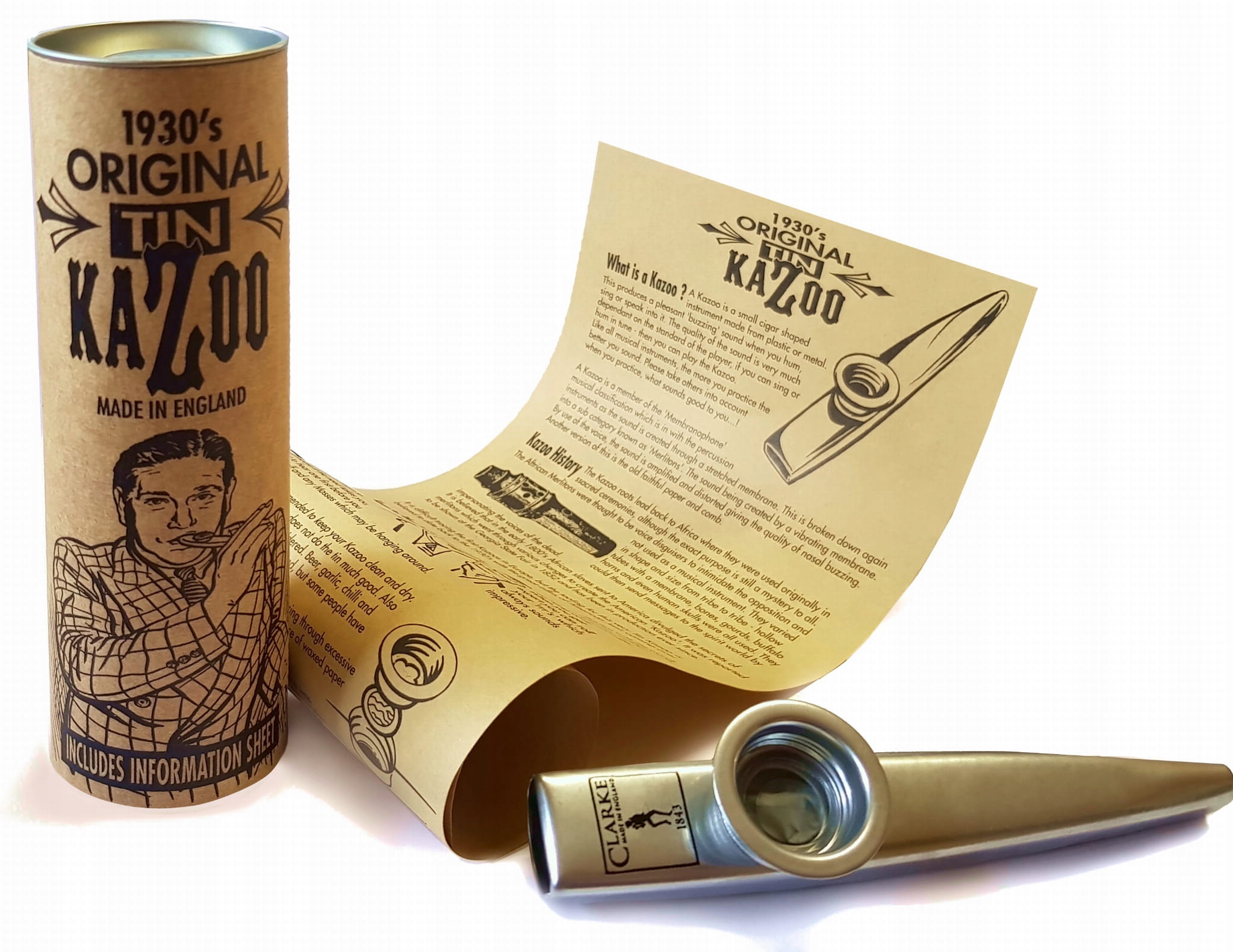 Kazoo виділяється з-поміж інших інструментів своїм чистим, приємним звучанням, він виготовлений в Англії, 100% з оцинкованого листового металу, покритий натуральним, срібним або золотим лаком.