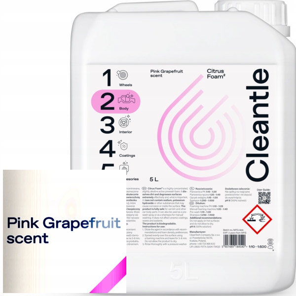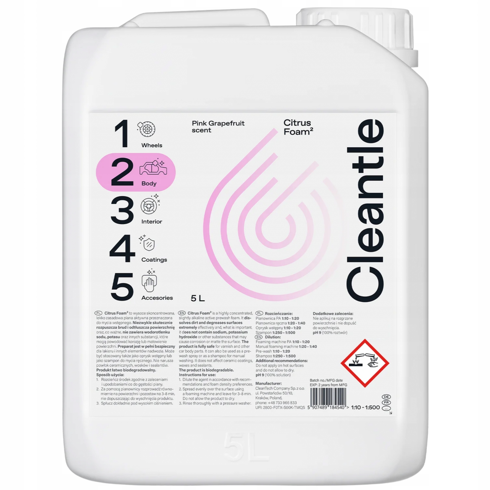 Cleantle Citrus Foam2 - це сильно концентрована, трохи лужна активна піна, призначена для попереднього клеєра. Надзвичайно ефективно розчиняє бруд і знежирає поверхню. Продукт не містить натрію, калію та інших речовин, які можуть спричинити корозію або відтінок поверхні. Що робить його повністю безпечним для лаку та інших елементів тіла. Підготовка також може бути використана у вигляді попереднього розпилення або як шампунь для миття рук. Він не порушує керамічні покриття, воски та герметики.