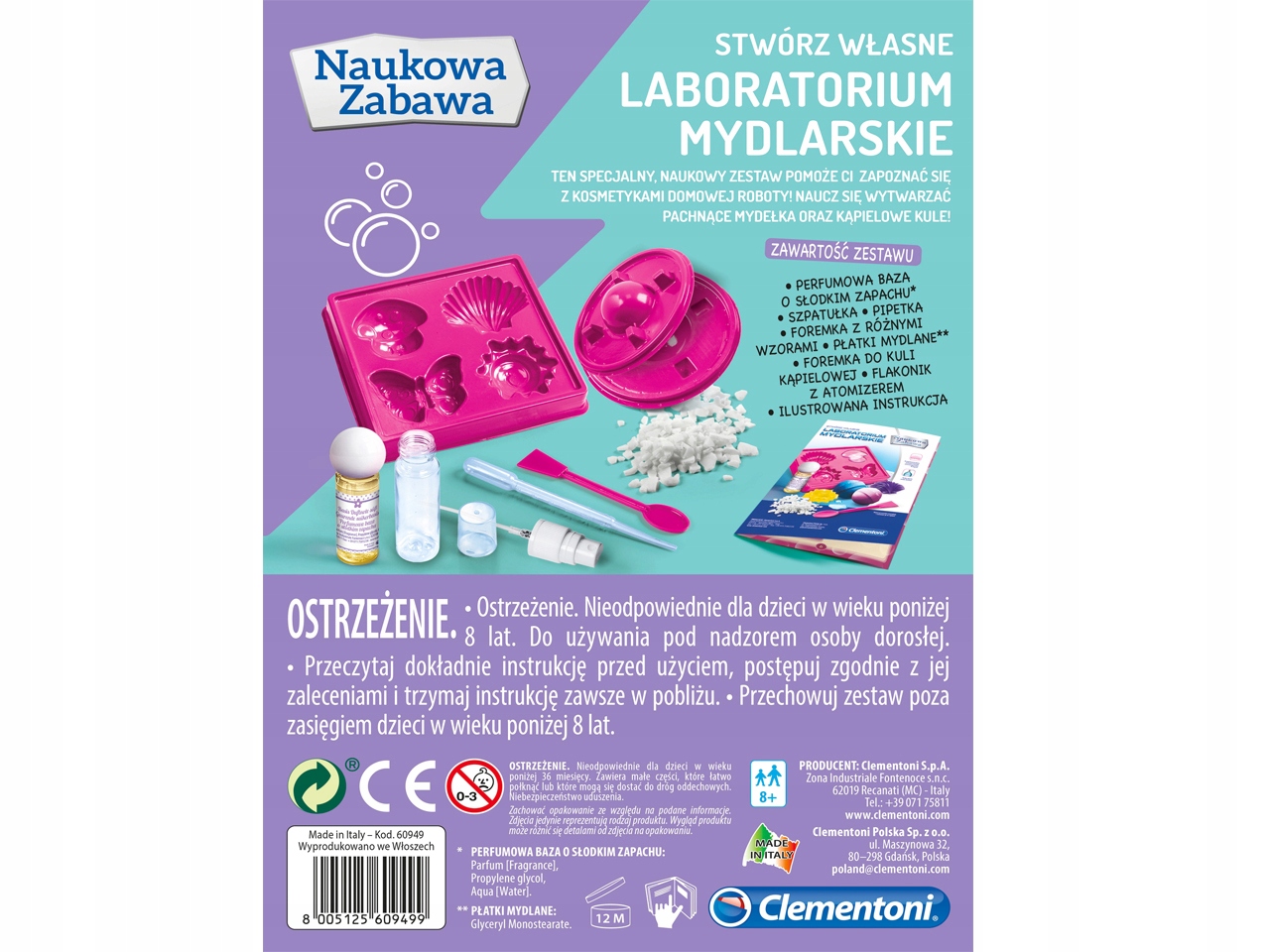 Завдяки різноманітним інгредієнтам і аксесуарам, що входять до набору, ви підготуєте справжню лабораторію миловаріння, в якій створите власне мило або бомбочку для ванни.