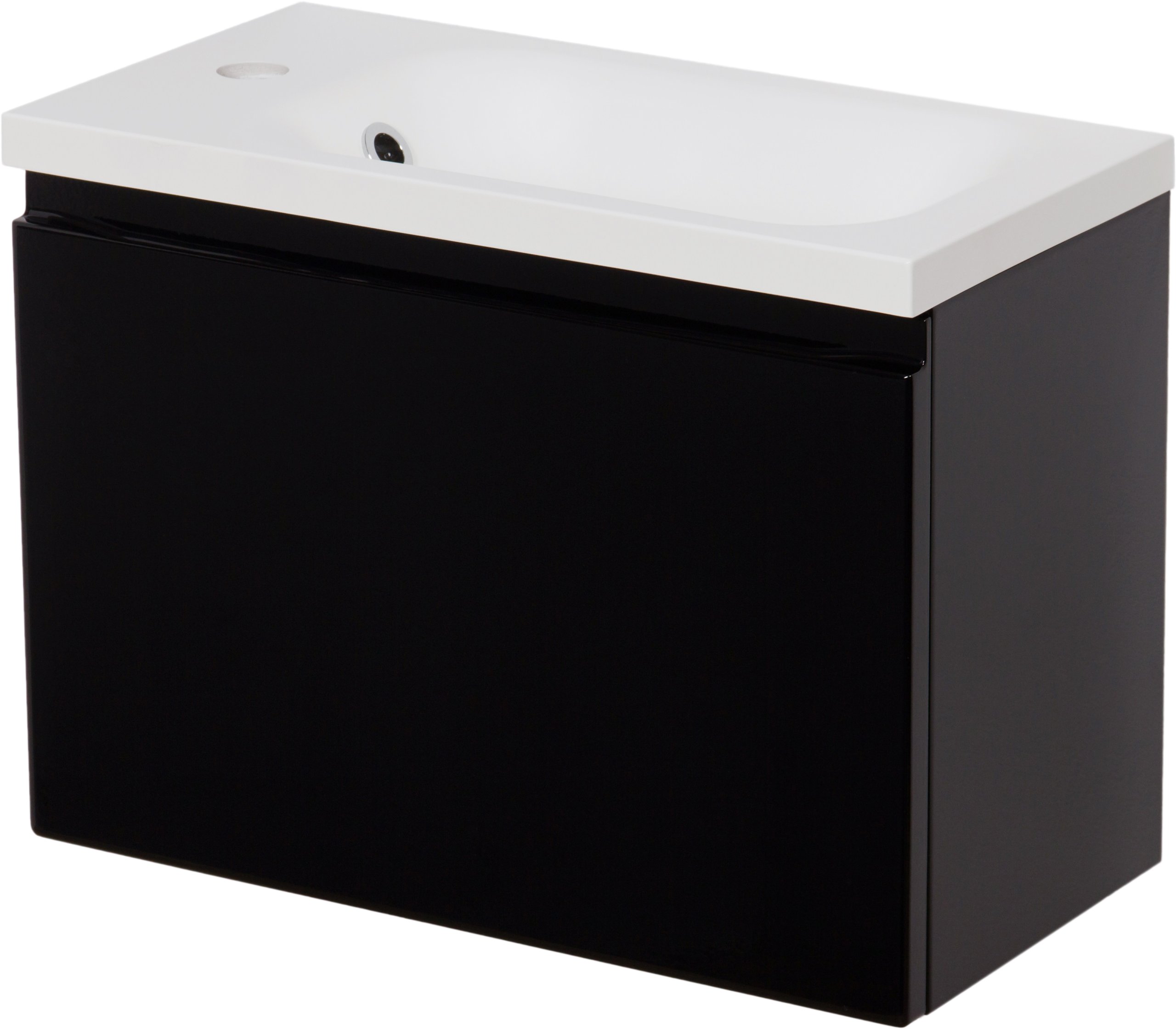 Глянцева чорна тумба під умивальник із білим доломітовим умивальником із серії CLER. Умивальник можна повертати - кран може бути з правого або лівого боку. В умивальнику є отвір для змішувача.