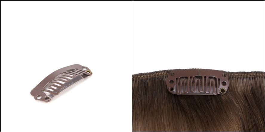 У наших наборах CLIP-IN використовуються кліпси розміру M, виготовлені з міцного металу, колір яких відповідає стрічкам, що продаються. Завдяки силікону вони чудово тримаються на волоссі навіть з дуже густими пасмами.