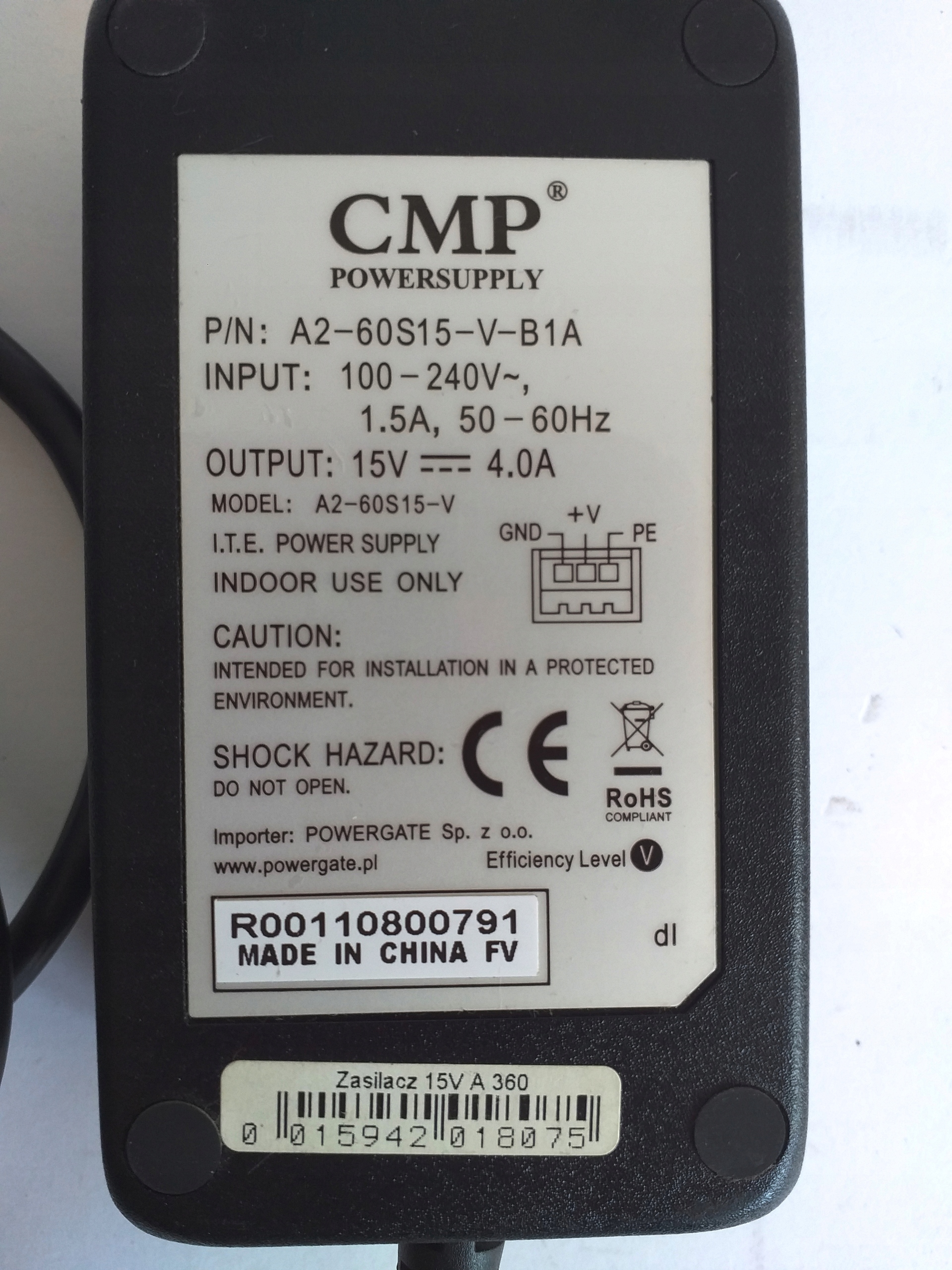 Використовується джерело живлення (перевірено) CMP A2-60S15-V-B1A. 1,2 м довжиною виходу кабелю, закінчений 3-контактним штекером. Шнур живлення живлення-3 (як для ПК або монітора). Гарантія