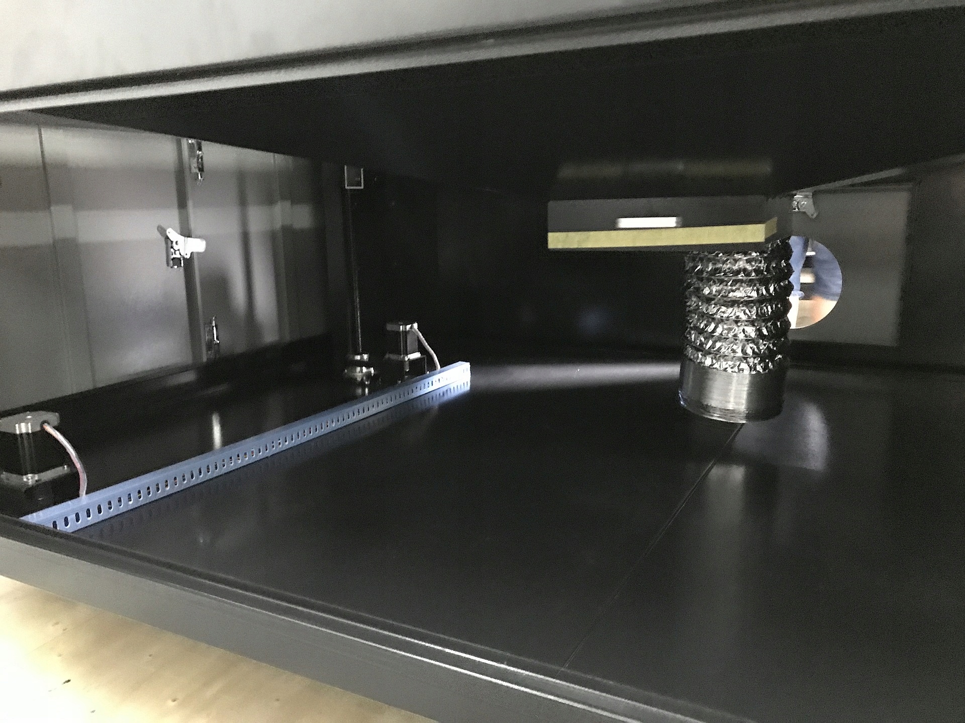 Верстат стандартно оснащений, серед іншого, з промисловим водяним охолоджувачем S&A, системою подачі повітря, електрично опущеним столом, відсмоктувачем вихлопних газів і червоною точкою, яка використовується для визначення місця різання.