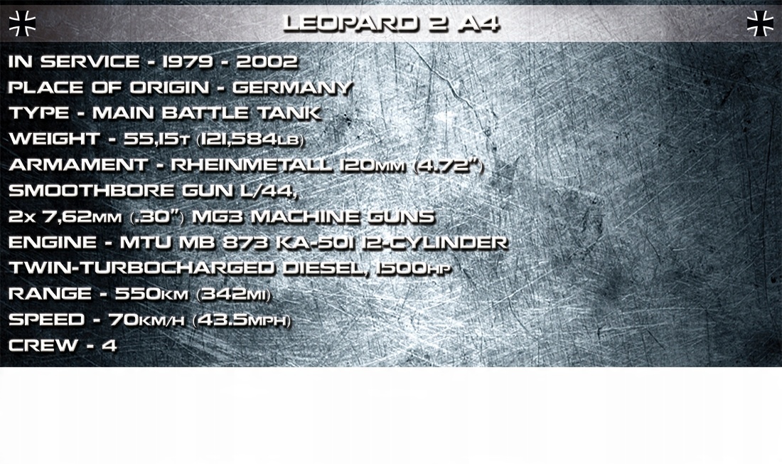 Leopard 2 A4 — німецький основний бойовий танк третього покоління, який є наступником танка Leopard 1. Він перебуває на озброєнні багатьох країн світу, а його збройні сили включають: Австрію, Чилі, Данію, Фінляндію , Греція, Іспанія, Нідерланди, Індонезія, Канада, Катар, Німеччина, Норвегія, Польща, Португалія, Сінгапур, Швейцарія, Швеція та Туреччина. Модель була випущена у співпраці з Deutsches Panzermuseum Munster, колекція якого включає саме цю машину з реєстраційним номером Y-678 620, відтворену з будівельних блоків COBI. 1
