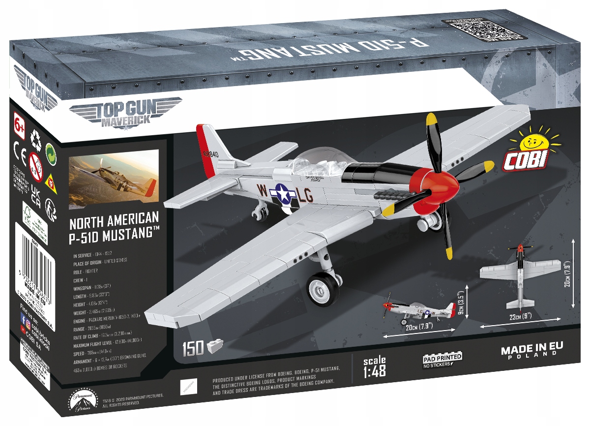 Mustang P-51D — унікальна модель кінолітака, випущена за оригінальною ліцензією TOP GUN: Maverick™. Головний герой фільму пишається тим, що має саме цей літак. Макет було відтворено зі 150 будівельних блоків COBI в масштабі 1:48. У набір входять тільки якісні відбитки, що стосуються фарбування плівкової машини. Ліцензійний Mustang з блоків COBI - це не тільки чудовий гаджет для кіно, але й модель, яка стане початком багатьох колекцій серед ентузіастів бойовика, авіації та військової техніки!