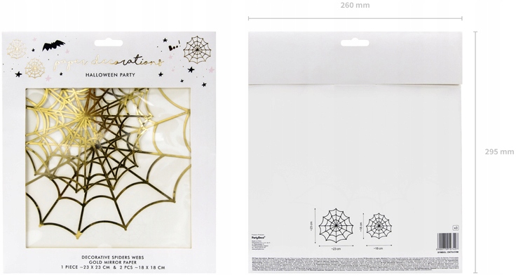 - Пожвавте свій інтер'єр оригінальними паперовими декораціями - Павутиною в ефектному золотому дзеркальному покритті! Ці унікальні прикраси у формі павутинки порадують своїм виглядом кожного. Набір включає одну більшу павутину розміром приблизно 23 х 23 см і дві менші розміром приблизно 18 х 18 см, які дозволять різноманітно аранжувати та використовувати для декорування простору.