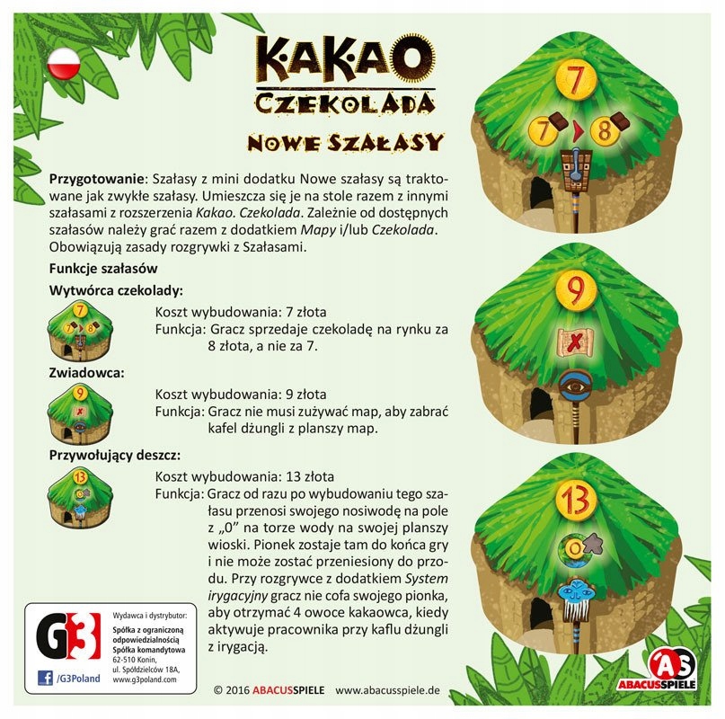 – прикликач дощу (відразу після побудови цієї хатинки гравець переміщує свою водоноску в поле «0» на водяній доріжці на дошці свого села. Пішак залишається там до кінця гри, і її не можна просувати вперед. Під час гри з доповненням «Іригаційна система» гравець не повертає пішака назад, щоб отримати чотири какао-ягоди, коли він активує робочого на плитці зрошувальних джунглів)