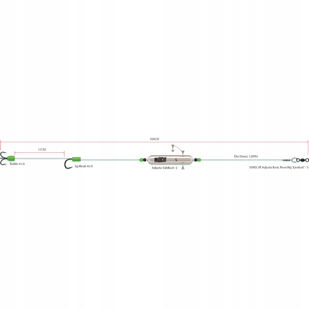 простий, однак, дуже ефективна сума з нашим Float Madcat Coffecta Subloat для риболовлі у швидкоплинних річках для живих приманок завдовжки 15-17 см. Побудований на товстій 1,0 мм Madcat Ultra-Moft Mono Leader. Довжина: 160 см. Розміри: S, M і L. POWER: 100 фунтів
