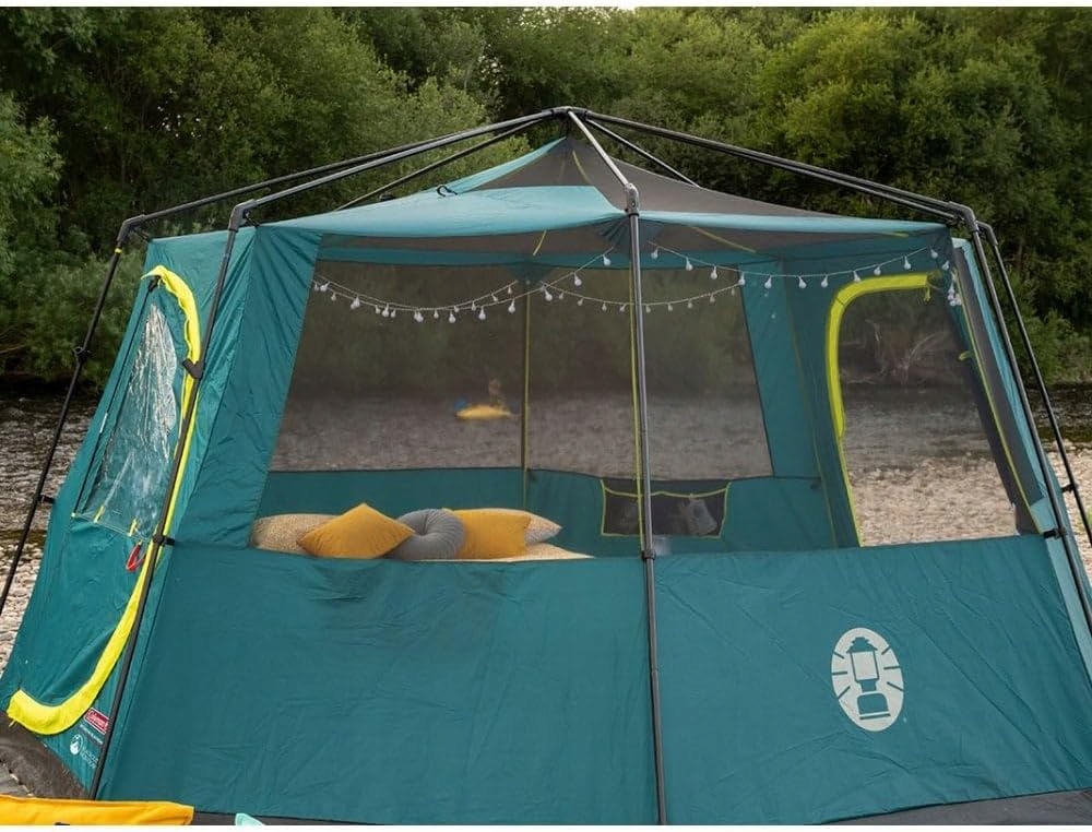 Повна висота голови в усьому наметі та унікальна форма привернення очей змушують восьмикутник пропонувати все необхідне. Завдяки 360 ° виду з кожної сторони та унікальному дизайну, цей помітний намет восьмикутника підходить для різних цілей: як розкішна спальня, простір для дітей або як ідеальна точка зустрічей на фестивалях. Спальня оснащена революційною технологією затемнення, яка зупиняє 99% денного світла від намету і забезпечує більш темне і прохолодніше спальне місце, завдяки якому вона не прокидається при першому сонячному світлі. Шість із восьми сторінок можна повністю відкрити, завдяки якому багато повітря та світла потрапляє в намет. На інших сторінках є запатентовані двері Coleman D, які можна відкрити та закрити, як звичайні двері з петлями.