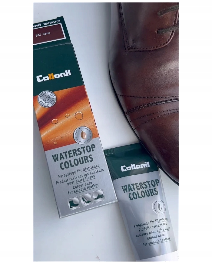 Waterstop Colors — це крем-фарба для всіх гладких гладких шкір, що забезпечує водостійкість, також рекомендовано для Gore-Tex, Sympatex та інших технологічно передових матеріалів. . Водночас він освіжає колір, інтенсивно живить шкіру та захищає від глибоко прониклого бруду та вологи.
