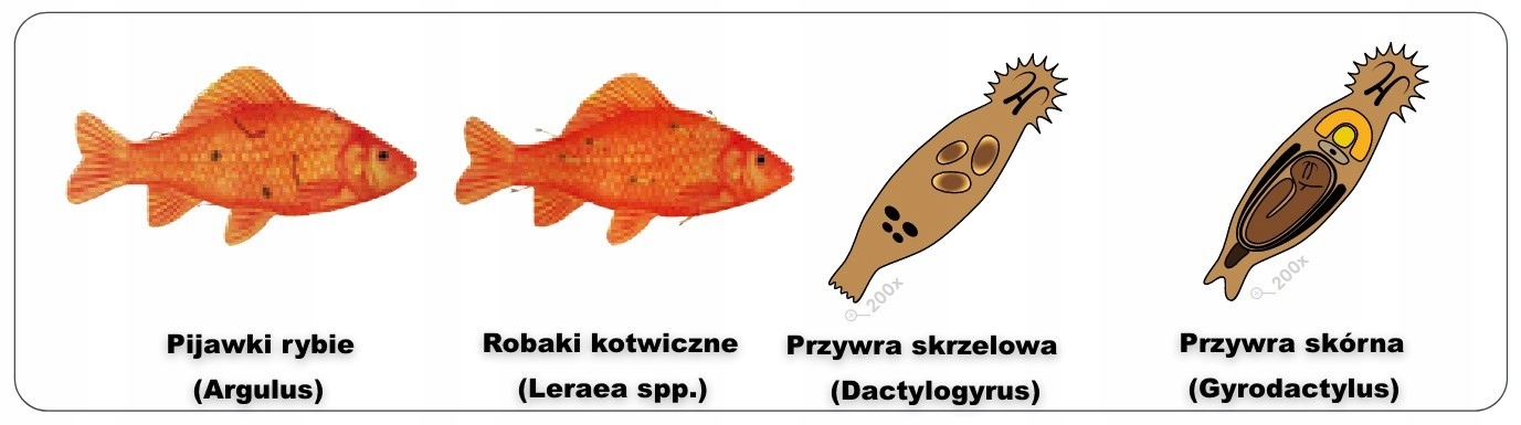 • риб’ячих п’явок (Piscicola) і якірних черв’яків (Lernea ).
