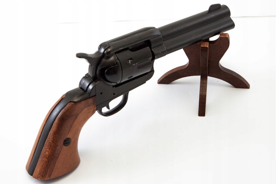 Кольт - марка і загальна назва ручного циліндра (револьвера) і багатьох видів вогнепальної зброї. Репліка виготовлена з ZnAlu, метал чорного матового кольору, ручка покрита тонованим деревом. Можливий сухий постріл. Кольт має обертовий барабан із шістьма патронниками. Барабан можна обертати безпосередньо - відтягуванням ударника до напівзведеного положення або він обертається автоматично механізмом при зведенні курка до повного положення. У репліці задня підпірна стінка оснащена кришкою барабана, яка відкривається вниз, що дозволяє здійснювати завантаження та розвантаження. Під стовбуром знаходиться робоча планка-розрядник - гільза пуансона, що проходить через камери барабана. До репліки входить декоративна коробка з патронами (6 шт.).