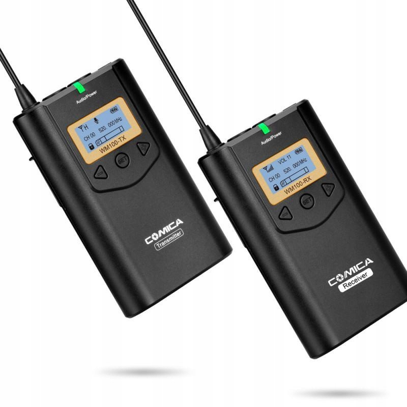 Comica CVM-WM100-це бездротовий набір, який включає передавач і приймач, мікрофон з краваткою з 3,5-мм роз'ємом та кришкою проти TAP, 3,5-мм XLR-адаптером та холодним кріпленням для одержувача для приймача та передавача. Набір може спілкуватися між собою на одному з 48 каналів у діапазоні 520-534.1 МГц. У разі перешкоди на вибраному каналі ви можете шукати решту шуму. Максимальний діапазон передачі - до 100 метрів. Передавач і приймач можна носити на поясі або встановити на прикріпленому кріпленні до камери. РК -екран містить основну інформацію про роботу пристрою, тобто індикатор сили сигналу та стан заряду акумулятора. Приймач та передавач живляться від 2 батарейних батарей (не включені).