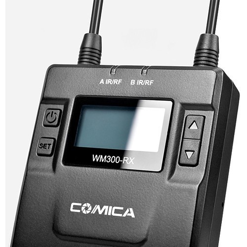 Comica CVM-WM300C-це сучасний бездротовий набір мікрофона. Він працює на основі частоти UHF, завдяки якому ефективний діапазон робочих місць становить до 120 метрів. Набір складається з приймача та передавача, мікрофона та додаткових аксесуарів, що покращують комфорт роботи. CVM-WM300C оснащений двоканальним приймачем з подвійними зовнішніми антенами. РК -підсвітка з високою резолюцією показує найважливішу інформацію, наприклад, умову приймача та акумулятора передавача, рівень звуку та вибір групи / каналу. Ви можете вибрати моно або стерео режим і виділити задану групу передавачем. Два канали приймача змушують розширити свій набір додатковим передавачем або мікрофоном. Передавач працює з прикріпленим звуком запису мікрофона в діапазоні 360 °. Передавач має контроль гучності на 16 -ступінь, а встановлений фільтр нижнього PASS зменшує непотрібні бурхливі звуки або звук вуличного руху.