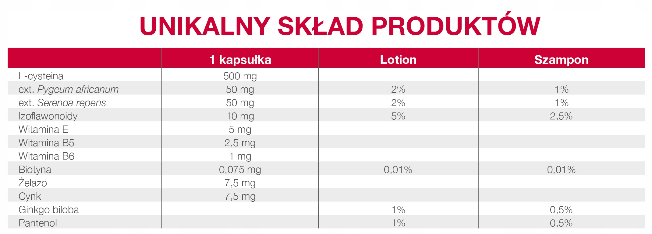 1 капсула містить: L-цистеїн - 500 мг; доп. Pygeum africanum – 50 мг; доп. Serenoa repens – 50 мг; Ізофлавоноїди – 10 мг; Вітамін Е – 5 мг; вітамін В5 – 2,5 мг; вітамін В6 – 1 мг; Біотин – 75 мкг; Залізо – 7,5 мг; Цинк – 7,5 мг.