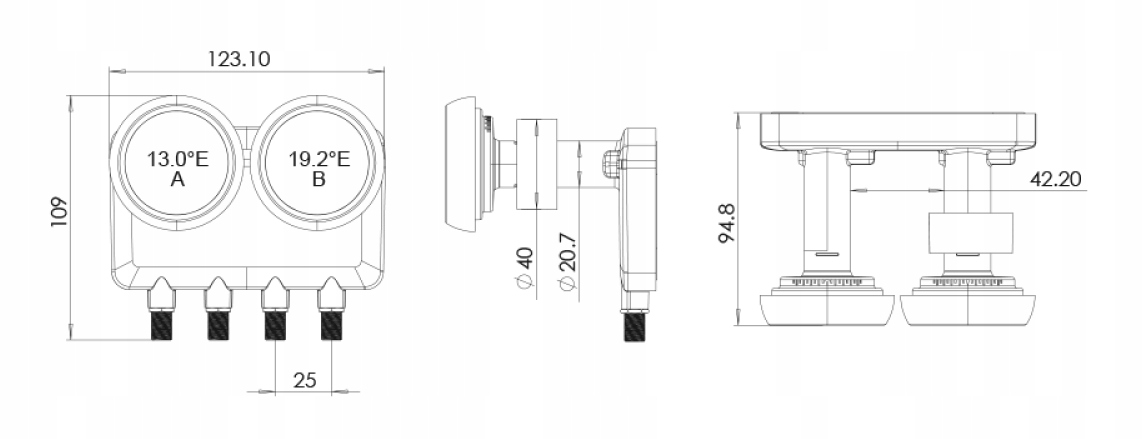 забезпечує чотири універсальні вихідні порти з діапазоном частот, якщо 950 ~ 2150 МГц. Кожен вихідний порт (тип F) також передає сигнали джерела живлення та управління. Поки не підібрати команду Diseqc, канал за замовчуванням знаходиться в положенні "Сб" (тобто 13 ° E). Поляризація (вертикальна/горизонтальна) та смуга (низька/висока) вибираються за допомогою сигналів управління 13/18ВДК та 0/22 кГц. Забезпечує чудову поляризаційну ізоляцію, фазовий шум і шум.