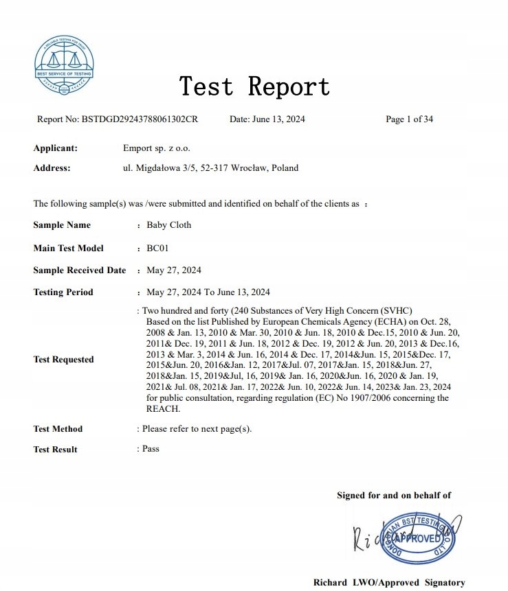 Щоб переконатися, що сповивання відповідає нашим вимогам, ми протестували його на наявність хімічних речовин відповідно до: Список SVHC (Регламент REACH Європейського Союзу). Наше сповивання пройшло перевірки, тож підтверджуємо, що воно безпечне!