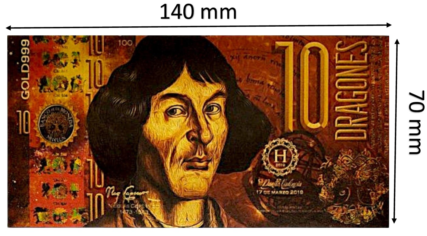 Банкнота унікального колекціонера, виготовлена з міцного пластику з ПВХ, прикрашена зображенням одного з найбільших розумів в історії - Ніколаус Коперник. Ця унікальна копія має вигадану конфесію 10 драконів, що робить його ще більш інтригуючим та привабливим для колекціонерів, любителів історії та альтернативної нумізматики.