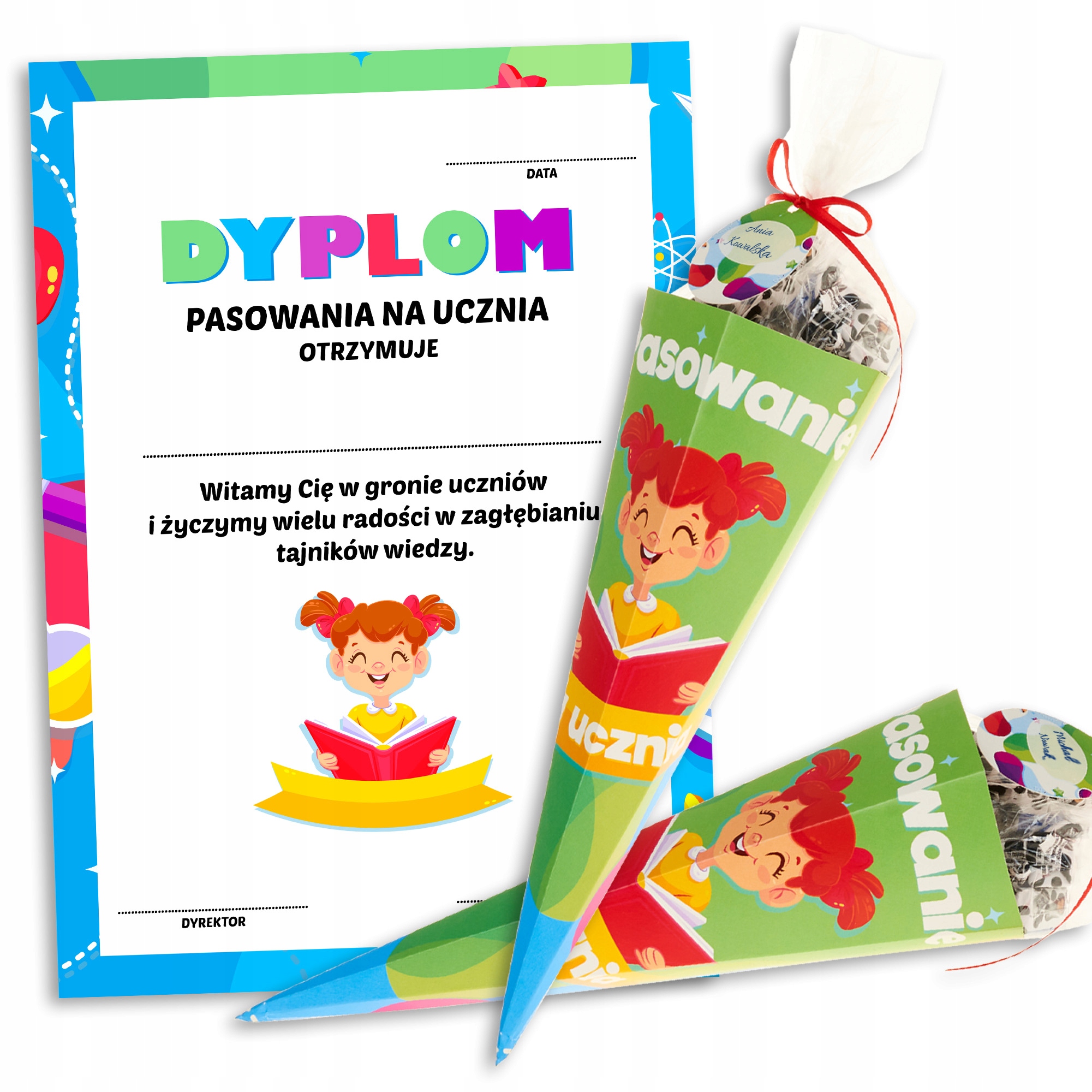 Кольоровий ріг достатку та диплом для студентів. Горн полегшить вашій дитині початок навчання в школі, а грамота нагадає вам про цей чудовий день. У нього можна помістити велику кількість солодощів або інших дрібних подарунків, які зроблять перші дні дітей у новій школі приємнішими. Це гарний жест від батьків або вчителів для маленьких учнів, які переживають стрес перед початком школи. Барвистий принт у версіях для хлопчиків і дівчаток. У набір входить підвіска, на якій можна написати ім'я дитини.