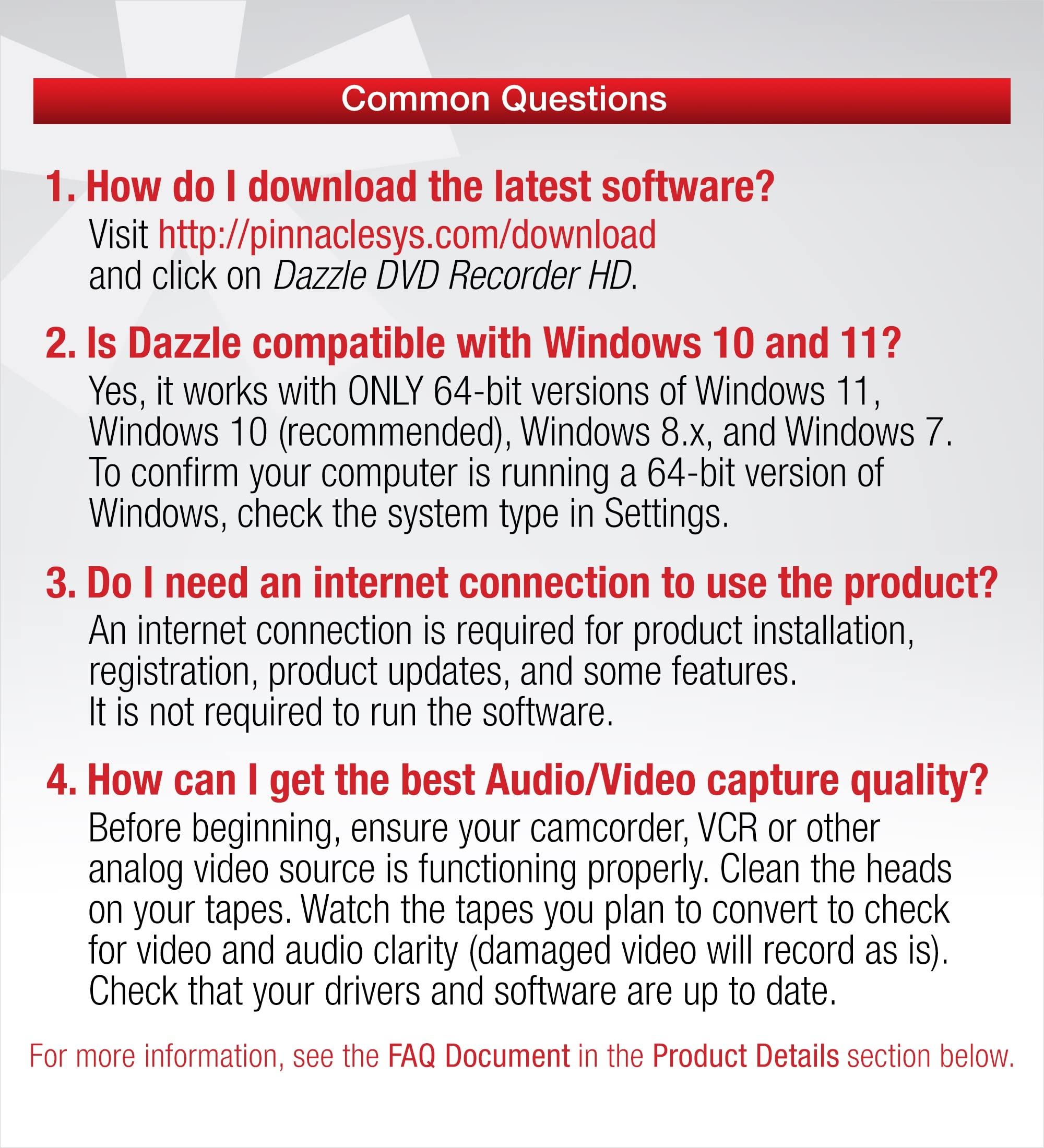 Набір містить конвертер, програмне забезпечення, кабелі та посібник користувача. Продукт торгової марки Pinnacle гарантує простоту використання та високу якість конвертації та запису. Перестаньте витрачати свої старі касети VHS і відновіть їх, перетворивши на DVD за допомогою Dazzle HD Converter.