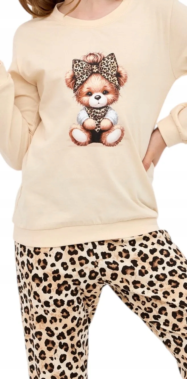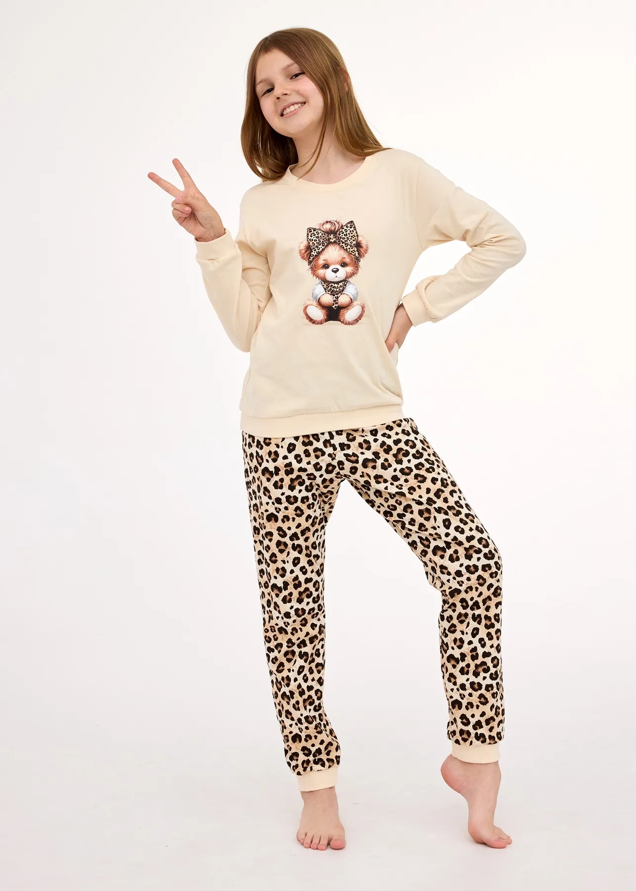 В комплекті довгі штани з бежево-коричневим леопардовим принтом.