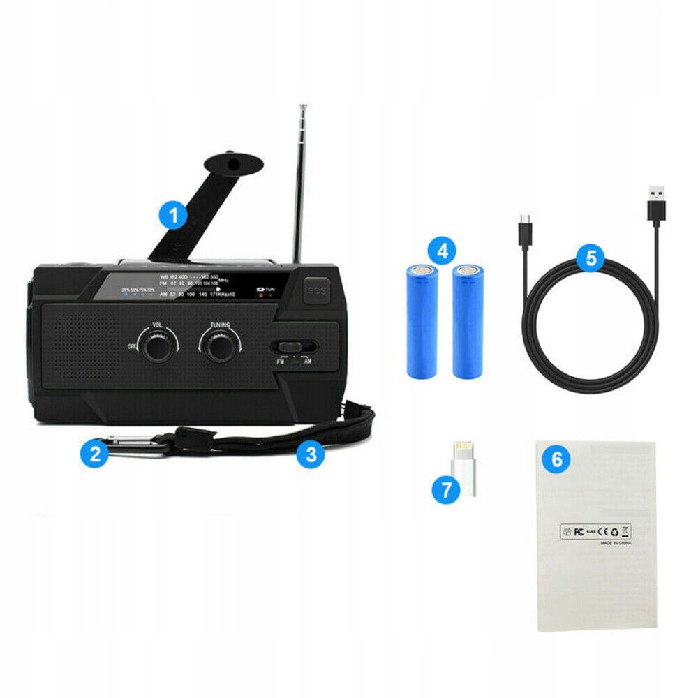 Вбудований акумулятор ємністю 4000 мАг для заряджання мобільного телефону в надзвичайних ситуаціях, портативне радіо AM/FM, надяскравий ліхтарик із 3 режимами, лампа для зчитування за допомогою датчика руху, сигналізації SOS, рукоятки та сонячної панелі для зарядки акумулятора. Сонячна радіостанція відповідає всім вимогам, дуже практична в надзвичайних ситуаціях.