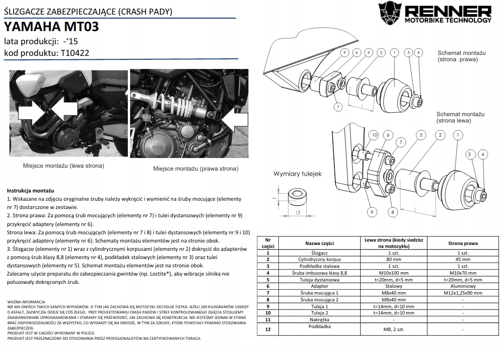 CRASH PADY RENNER YAMAHA MT03 -'15 2xFREE