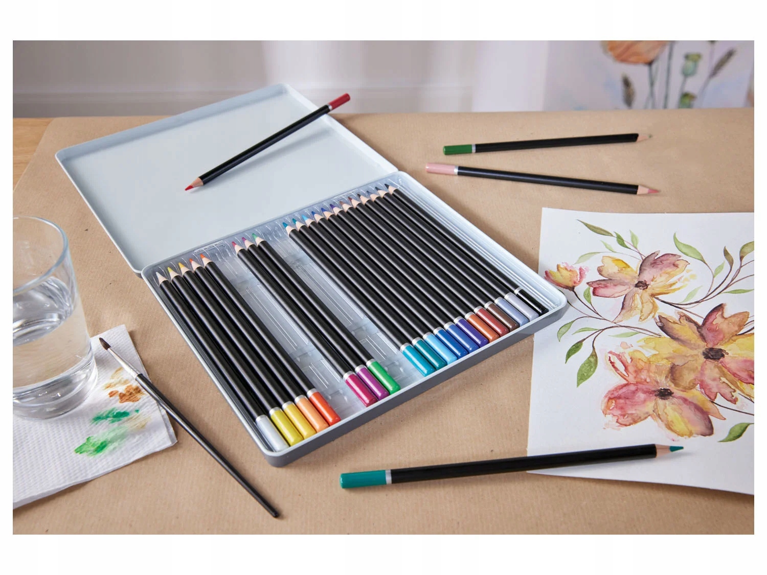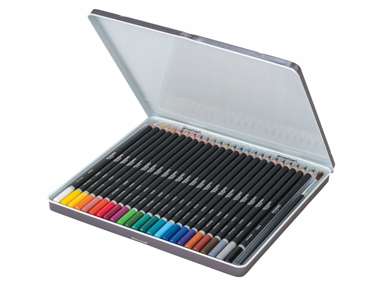Набір з 24 штук акварельних олівців з щіткою щетини та металевим корпусом.