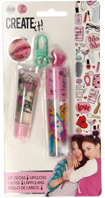 Набір від Create Itце насолода для маленьких любителів краси! Цього разу в набір увійшли блиски для губ: один у контейнері зі спеціальною пензликом, а інший у вигляді віджимного тюбика з біркою, завдяки якій косметику можна брати з собою куди завгодно. Додатково кулон має декор сердечко.