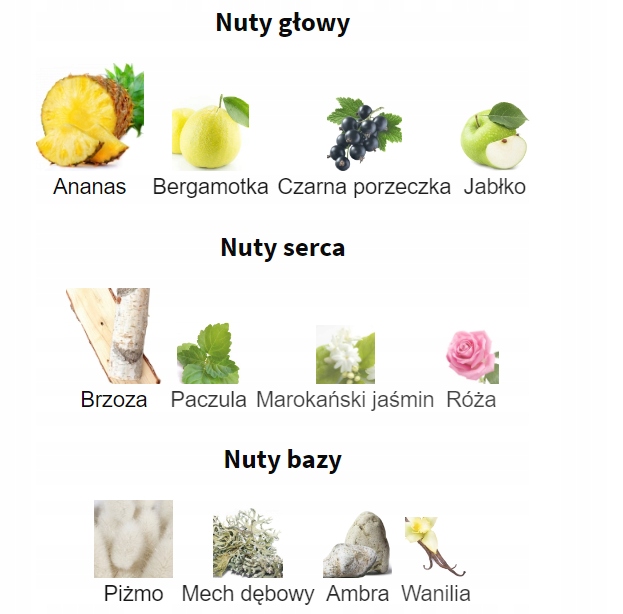 Верхні фруктові ноти - це аромати чорної смородини, яблук Calville Blanc, свіжого бергамоту та соковитого ананаса. Серце композиції випромінює сухі акорди дерева берези і пачулі, підкреслені ніжною чистотою троянди і жасмину. Базові ноти побудовані на акордах дубового моху, теплої ванілі, мускусу та амбри.