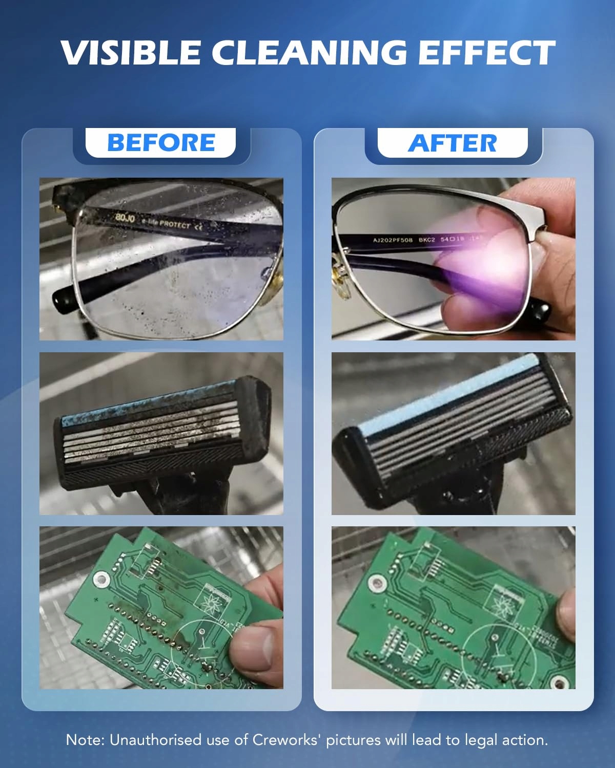 Широке застосування - Насолоджуйтесь професійним прибиранням та стерилізацією в комфорті власної кухні чи лабораторії. Він швидко видаляє іржу, притуплення, варене вугілля та інші плями із зубних протезів, ювелірних виробів, столових приладів, іграшок для дітей, окулярів, ручок тощо