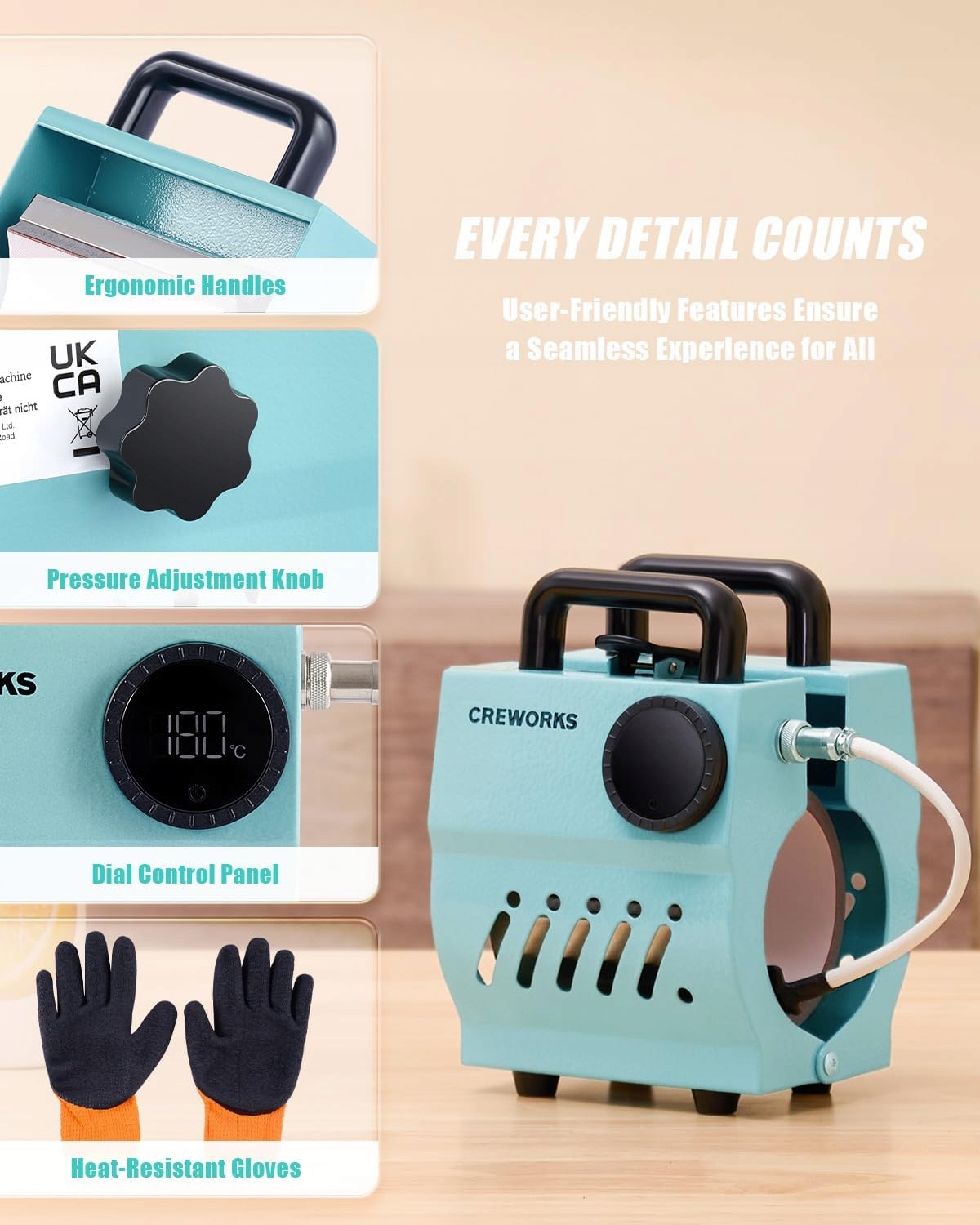 - Надійна безпека -Цей перенесений прес для чашок і чашок оснащений високотемпературним силіконовим килимком для навіть прасування та відмінних результатів. Він постачається з парою рукавичок, тож ви можете безпечно виконувати свою роботу