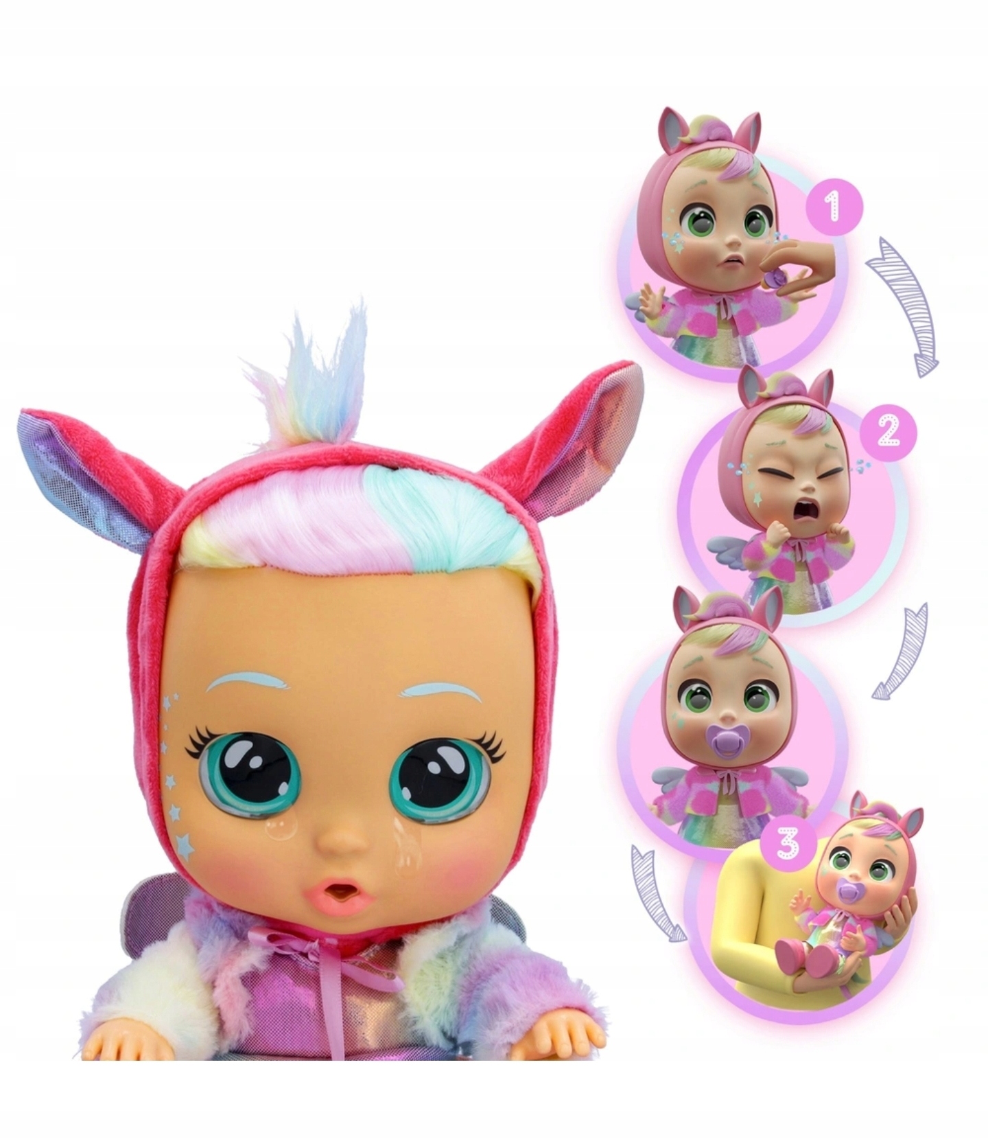 Зустрічайте ляльку Cry Babies Fantasy Hannah у новому образі! Як і в усіх нових оновлених Cry Babies, у неї надзвичайно м’яке волосся, ще більш реалістичні кришталеві очі та покращене, м’якше обличчя. Вага також зменшилася, і тепер вона вперше одягнена в миле справжнє фентезійне вбрання. Звичайно, як і всі Cry Babies, вона видає звуки плачу та реалістичні дитячі звуки, коли ви забираєте її соску. Якщо ви йому повернете, він перестане плакати. Ви також можете обережно покласти їх, щоб заспокоїти. Ханна поставляється зі змінним одягом, парою взуття та відповідною соскою.