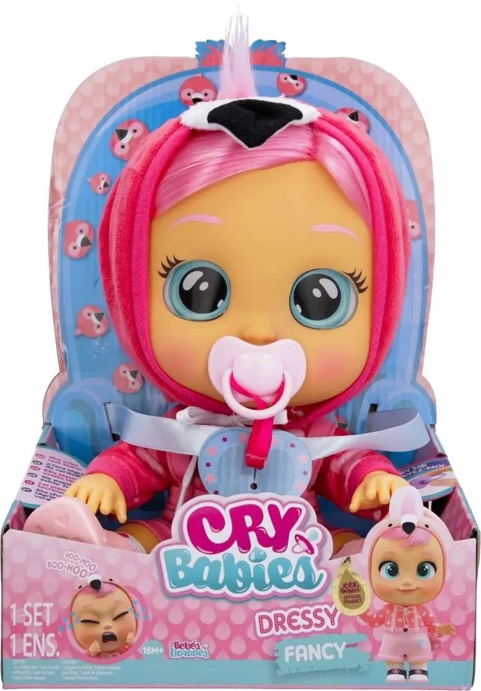 Ляльки легші та мають м'якше обличчя. Звичайно, як і всі немовлята, вони плачуть справжніми сльозами і видають справжні звуки плачу немовляти. Обійміть їх і дайте їм соску, і вони відразу заспокояться! Щоб лялька почала плакати, просто налийте води в спеціальну ємність, розміщену на її потилиці, і натисніть кнопку внизу або увімкніть ляльку і вийміть соску з її рота. Baby Fancy одягнений у красивий індивідуальний костюм фламінго (куртка, шорти, шкарпетки, туфлі). Особливості: