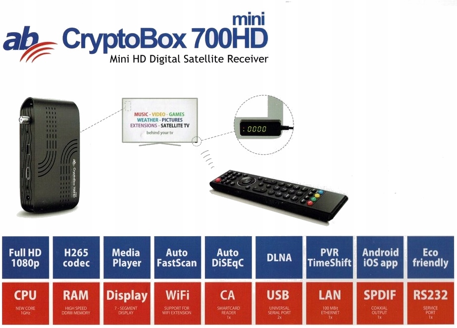 Просматривая «CryptoBox AB 700HD MINI DVB-S2 FullHD H.265 CCCAM тюнер FASTSCAN PL», вы можете быть уверены, что данный товар из каталога «Тюнеры» будет доставлен из Польши и проверен на целостность. В цене товара, указанной на сайте, учтена доставка из Польши. Внимание!!! Товары для Евросоюза, согласно законодательству стран Евросоюза, могут отличаться упаковкой или наполнением.