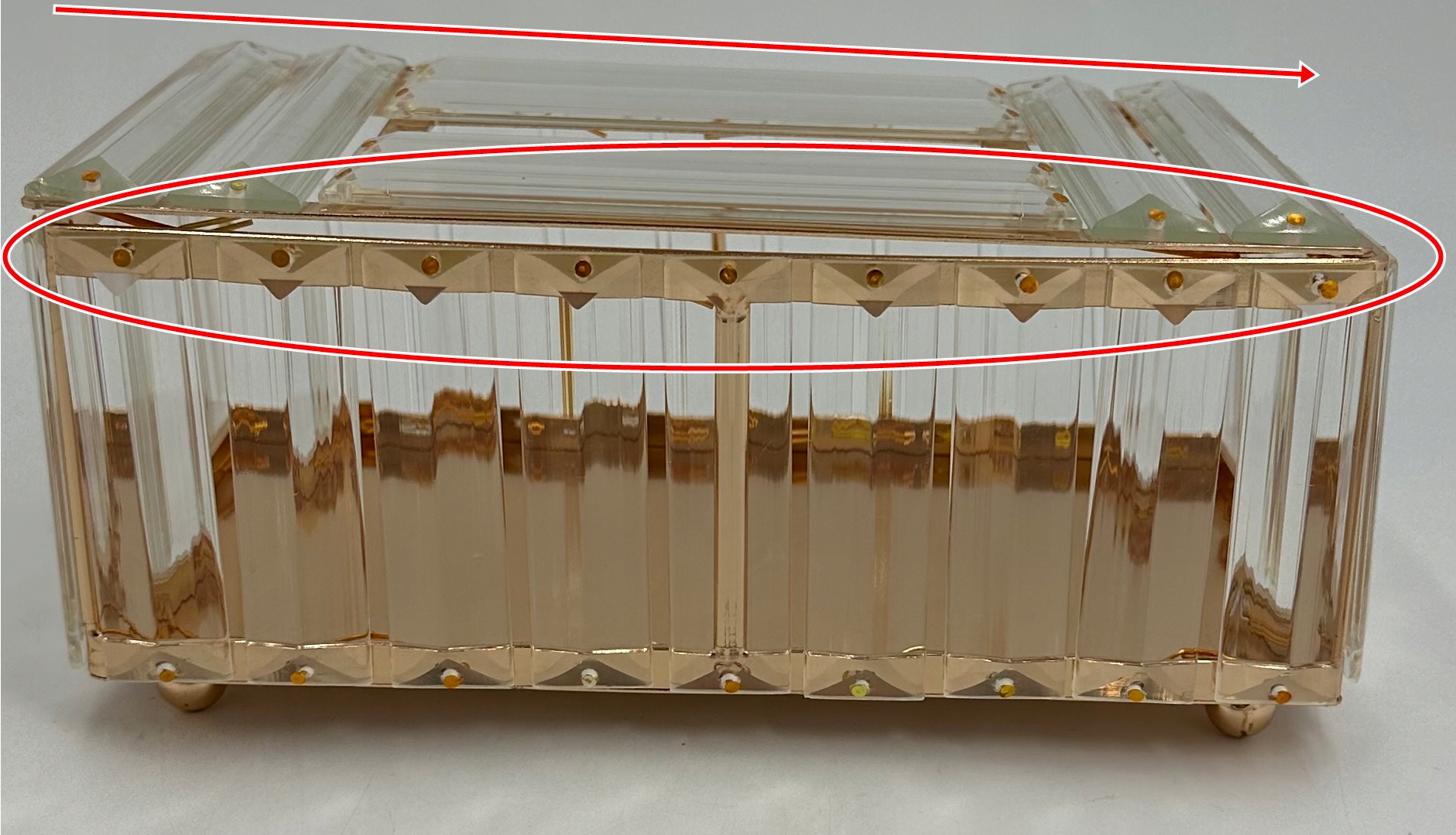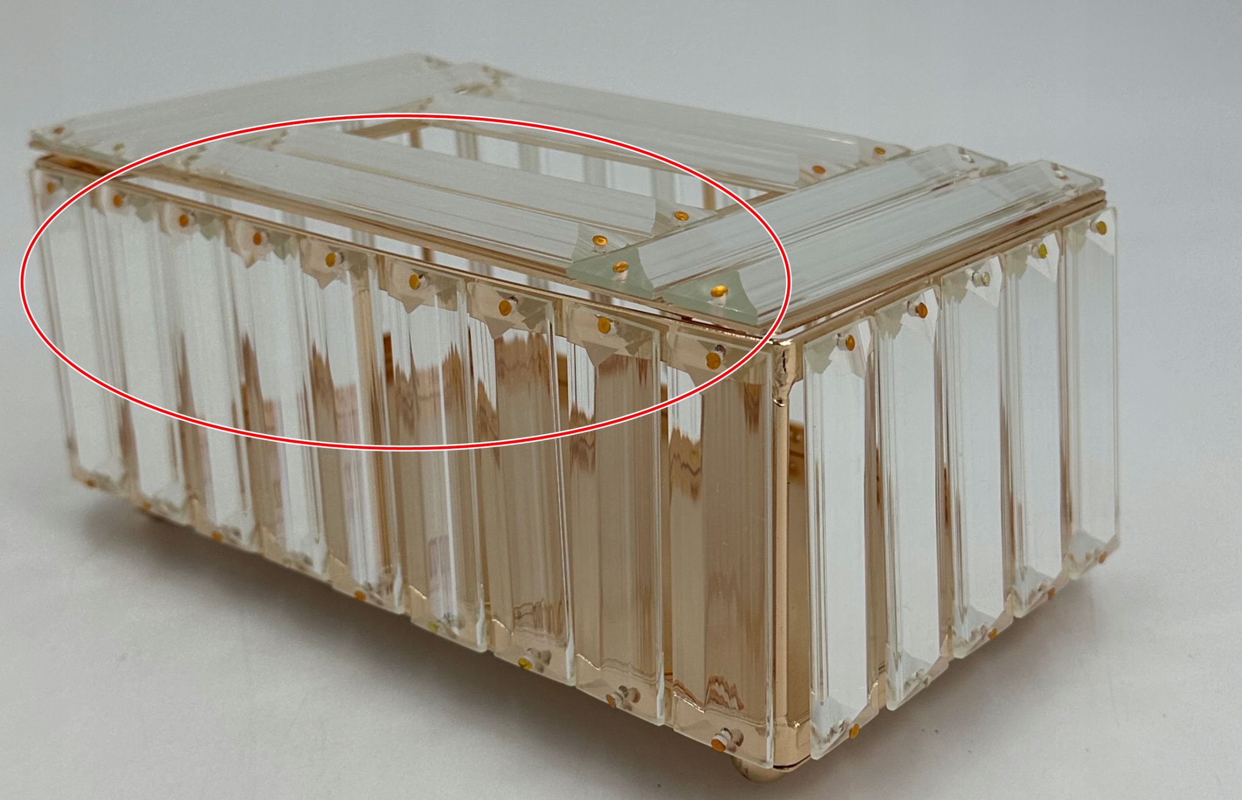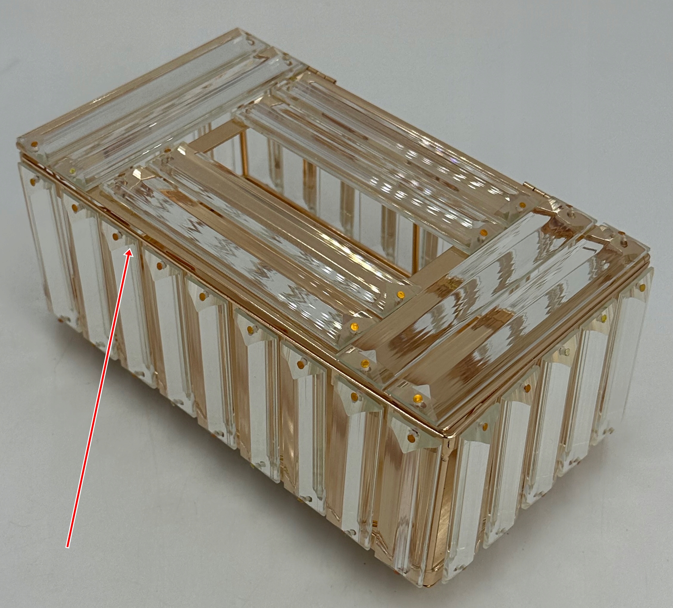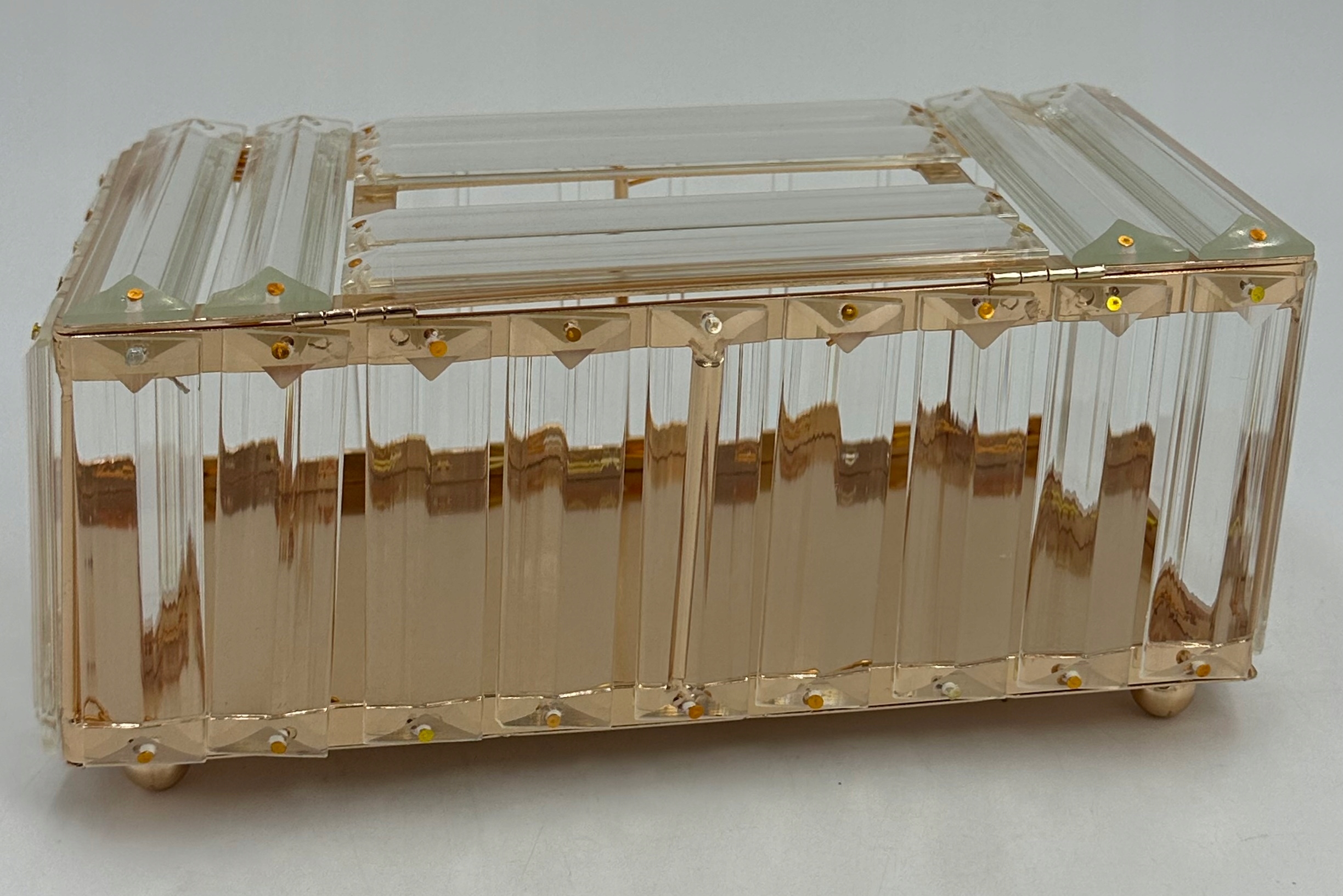 Коробка серветок із кристалами з боків і зверху. Дно контейнера металеве, оброблене чотирма круглими підніжками. Отвір прямокутний.