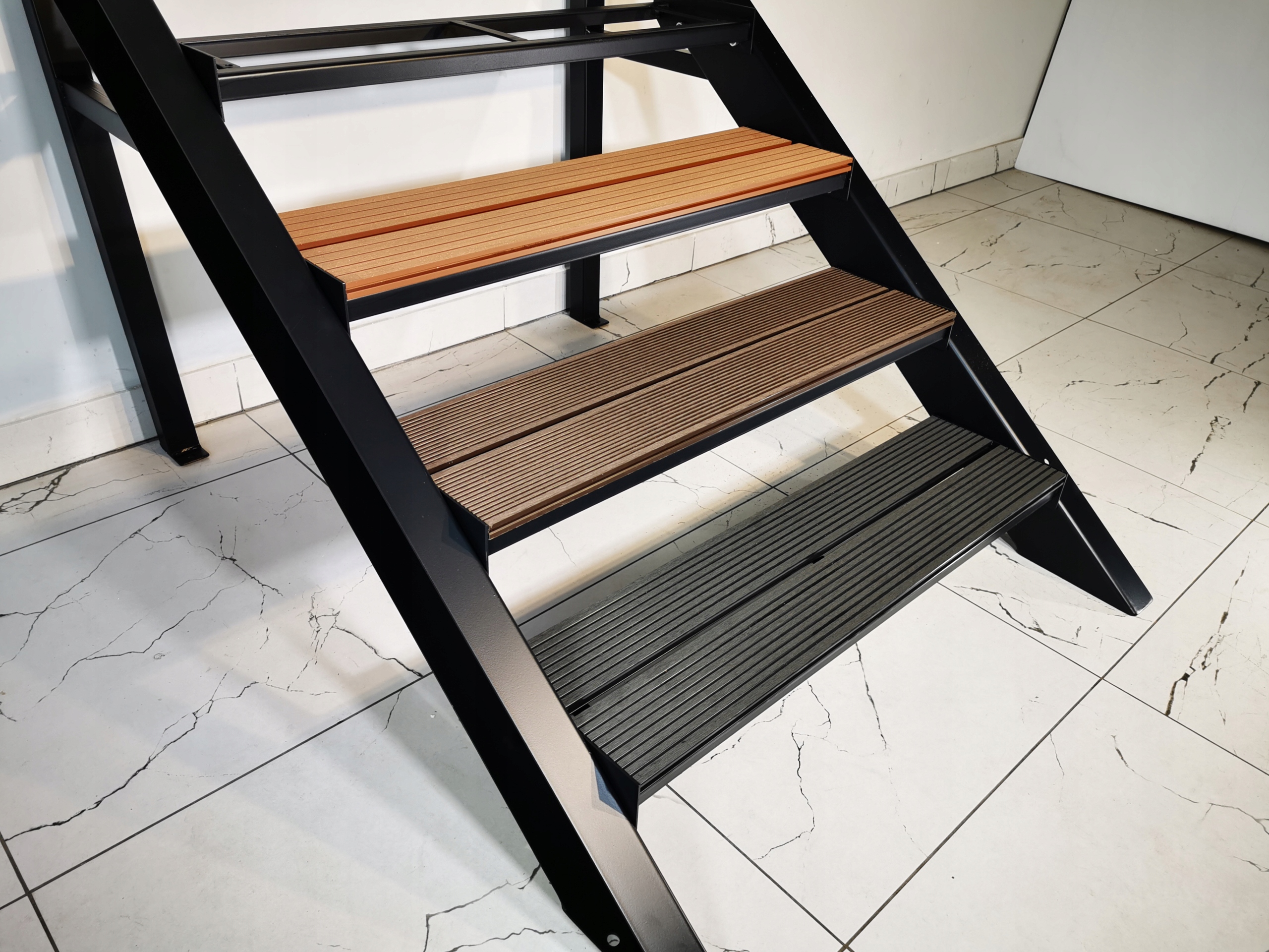 Schody metalowe Csystem, stopnie 90x24cm z deski tarasowej, kompozytowej
