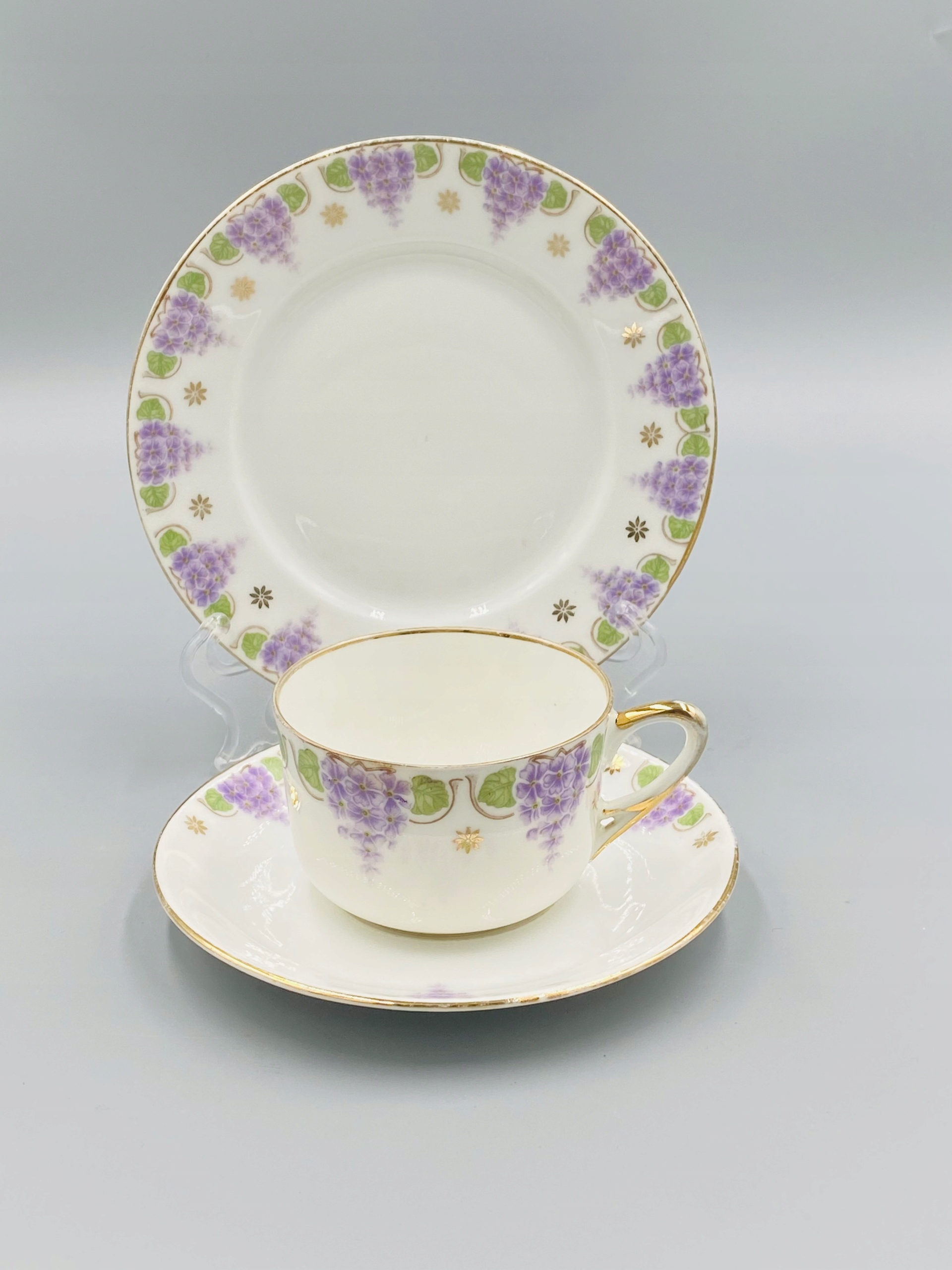 Біла порцеляна, прикрашена квітковими мотивами. Позолочені краї. Дуже романтичний і ностальгічний набір для сніданку в фіолетово-зелено-золотій фарбі.
