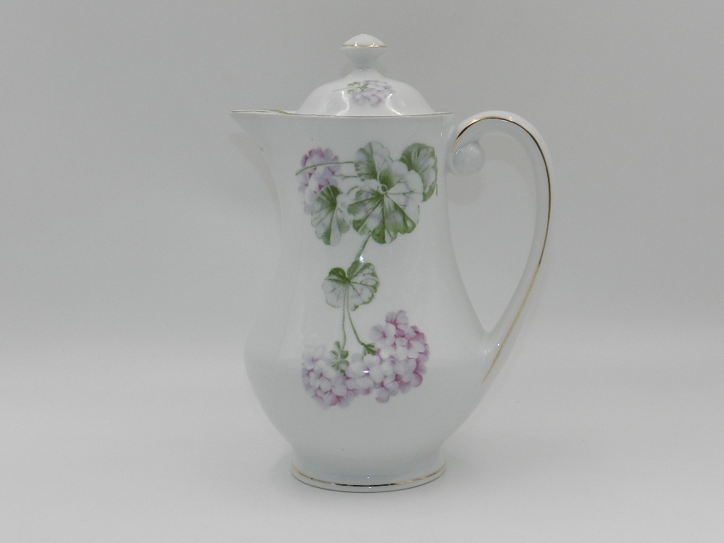 Біла порцеляна надзвичайно гармонійної форми з чудовим мотивом фіолетової герані. Усе оздоблено тонкою золотою позолотою.