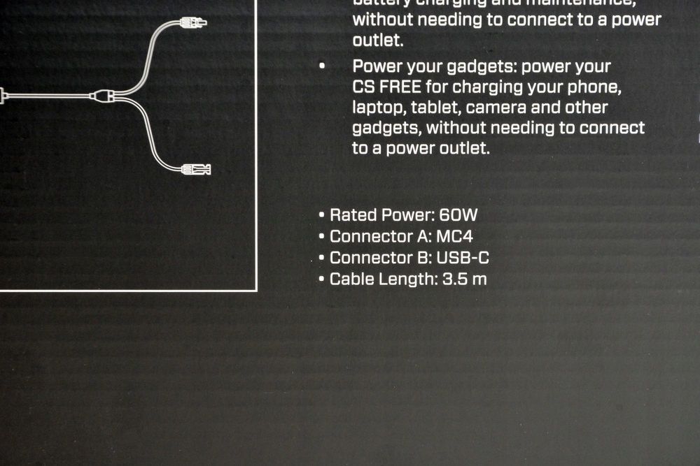 Виготовлений із надміцного скловолокна, просто розгорніть його та підключіть до CS FREE на протягом секунд і бути звільненим від мережі. Заряджайте та обслуговуйте акумулятор свого автомобіля або заряджайте портативні пристрої, як-от смартфони, планшети та ноутбуки, навіть коли ви не перебуваєте поблизу електричної розетки.