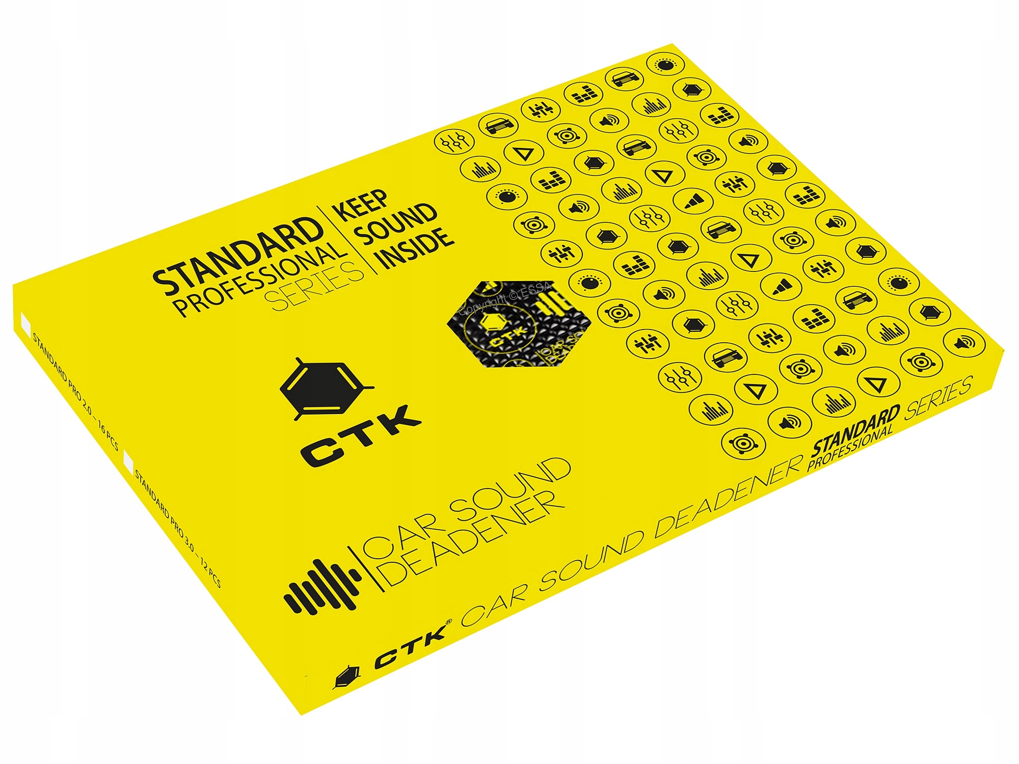 CTK Standard Professional - це сучасний, технологічно просунутий, вібропоглинаючий матеріал з низьким резонансної частоти у вигляді самоклеючого килимка з композиту бутилкаучуку і спеціалізованих полімерних добавок. Зовні екструдована алюмінієва фольга товщиною 100 мікрометрів (0,1 мм), яка зміцнює і механічно захищає демпферний матеріал і додатково покращує його акустичні властивості. Завдяки спеціально підібраному бутилкаучуковому композиту досягнуто високої гнучкості складання, помірної ваги та високих адгезійних властивостей (дуже висока в'язкість і адгезія до основи, порівнянна з килимками Premium, яка з часом ще більше зростає), зберігаючи високу ефективність гасіння вібрації на рівні, запропонованому аналогічними матеріалами з більшою товщиною та більшою вагою. Віброакустичні килимки CTK серії Standard Professional - це продукція, призначена для професійних компаній, що встановлюють автомобільну аудіотехніку та звукоізоляцію транспортних засобів, а також для більш вимогливих клієнтів, які цінують високу якість, ефективність і комфорт за доступною ціною.