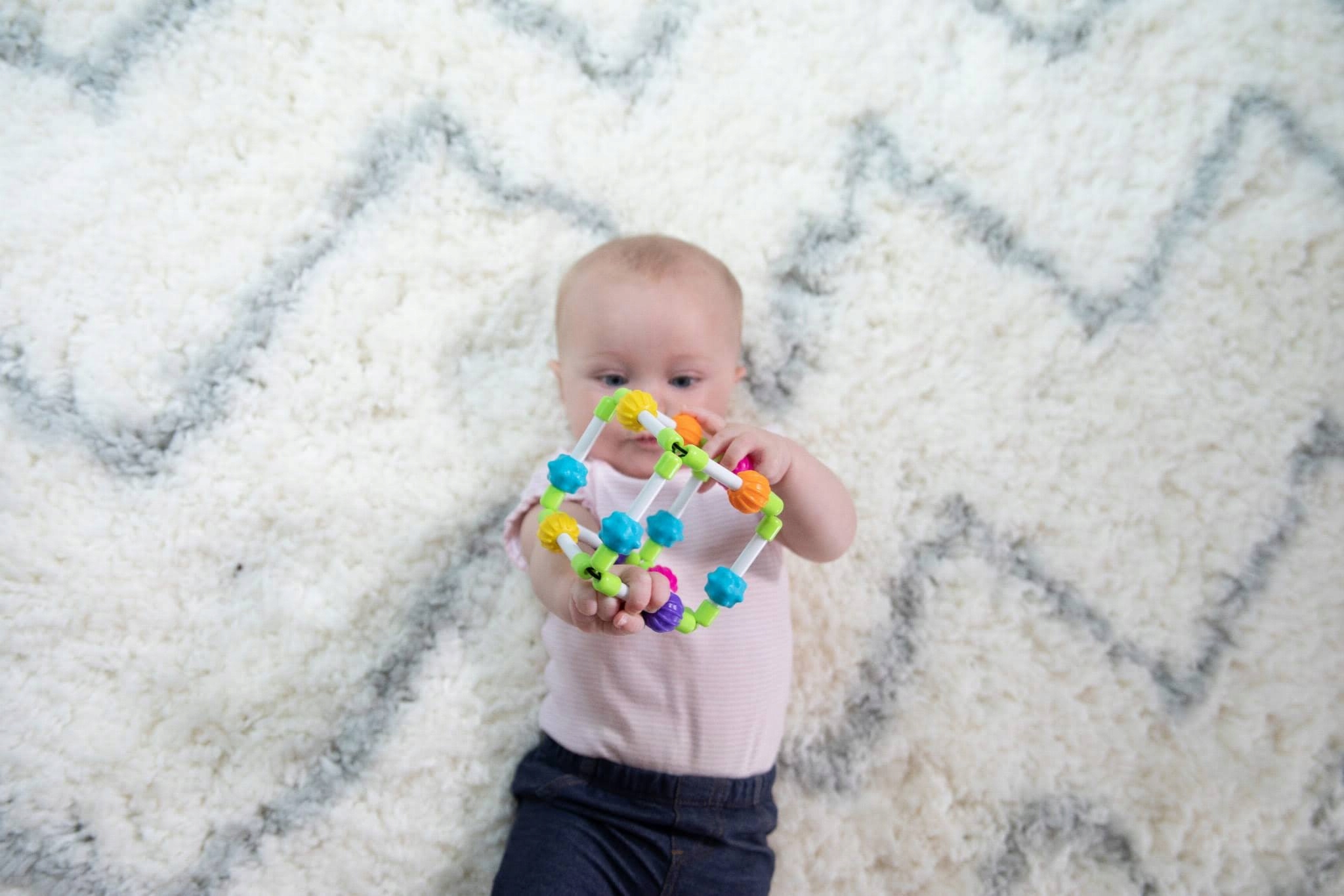 Кожен край кубика Quubi з’єднаний гнучкими гумовими стрічками, щоб маленькі ручки могли їх м’яти, згинати та крутити. Для додаткової сенсорної стимуляції та захоплення дитини різнокольорові гумові намистини ковзають і обертаються по краях куба, ідеально підходять для кусання.