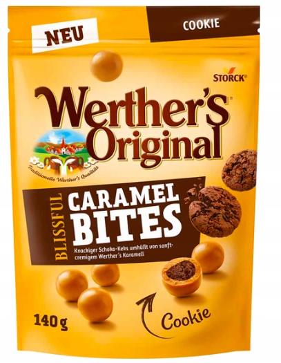 Werther's Original Blissful Caramel Bites Cookie — це карамельні кульки з начинкою з хрусткого какао-печива. Їх невеликий розмір робить кульки універсальними у використанні.