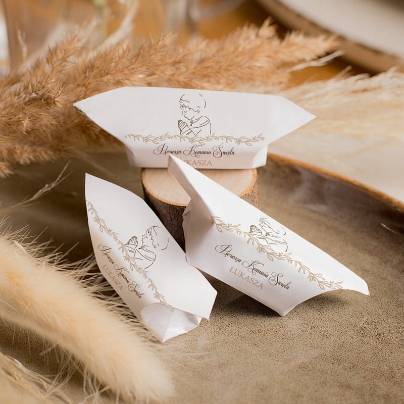 Індивідуальні солодкі подарунки є елегантним доповненням до гостей на Перше Святе Причастя дитини.
