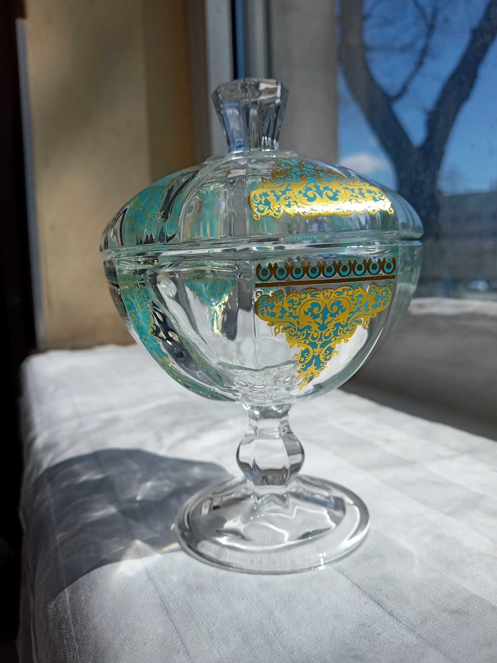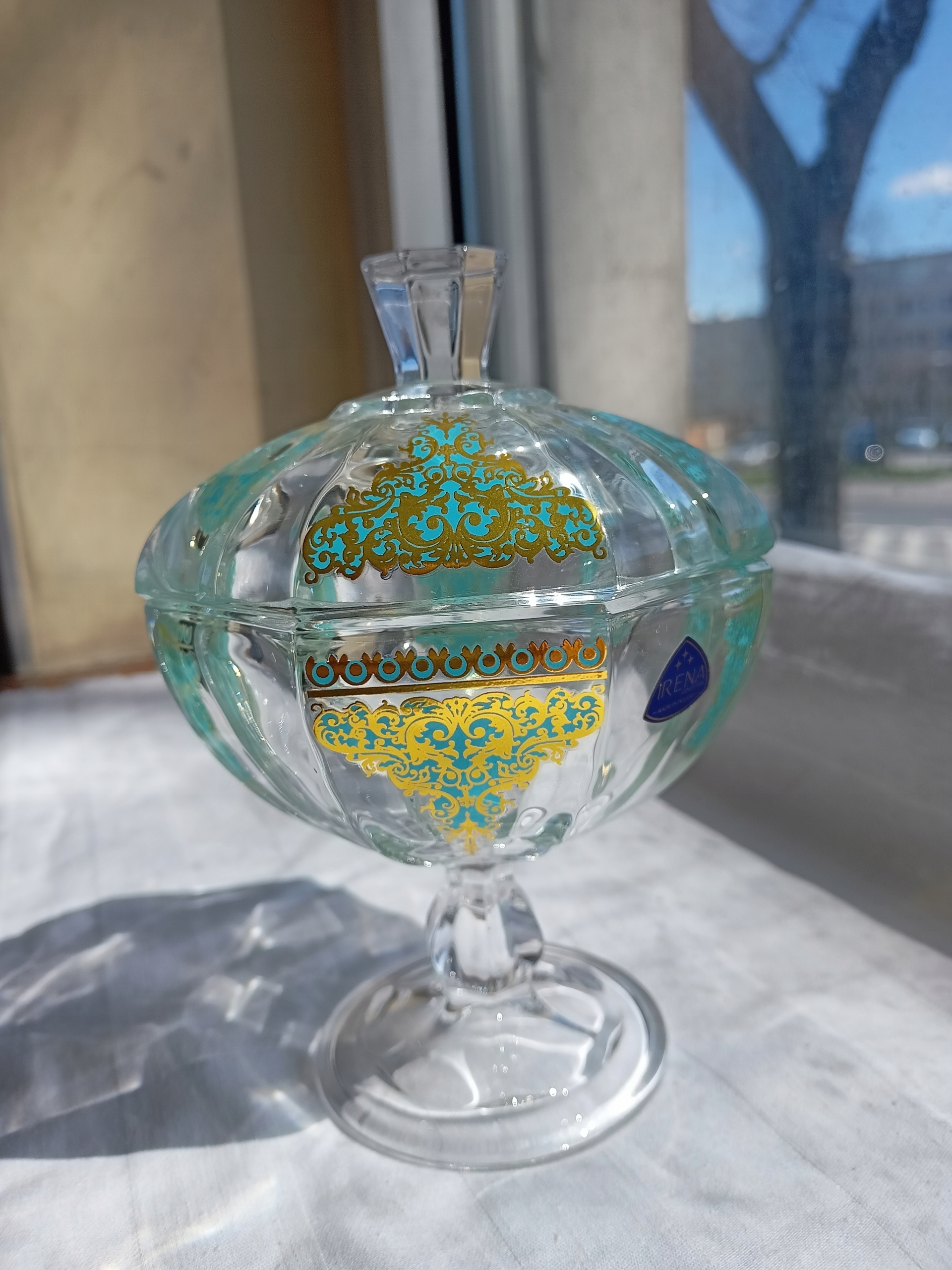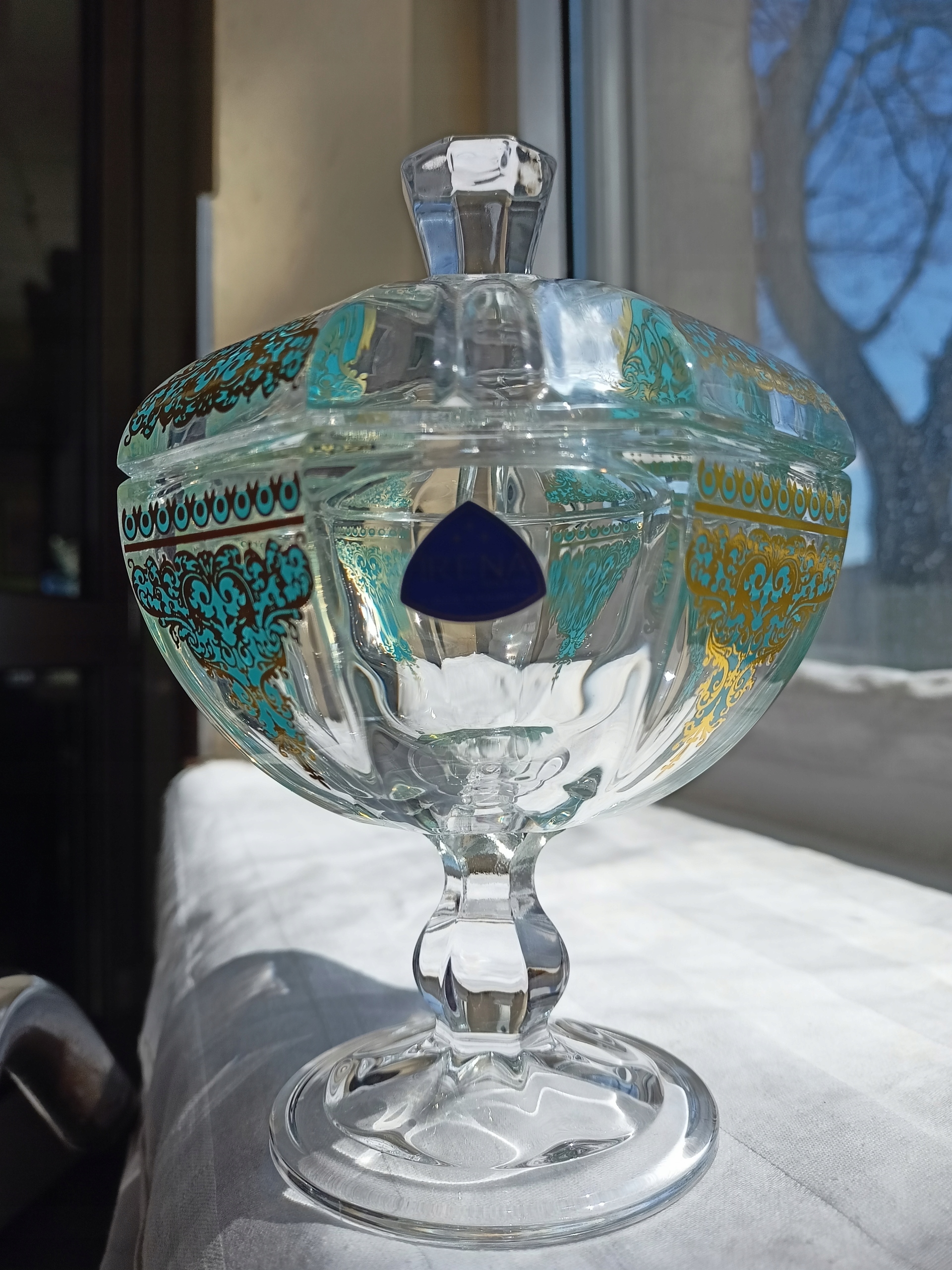 - Кондитерська на нозі з кришкою, зробленою в теперішній неіснуючій платі "Ірена" в Інороклаві. Пентекоратор Huta - один шматок. Не зустрічається на польському ринку. Вісім - кондитерський, прозорий, прозорий з відкритою роботою, золото - бірюзове прикраса. Для фіксації та захисту вистрілено на 500 градусів. CM. Підпис Huta Irena.