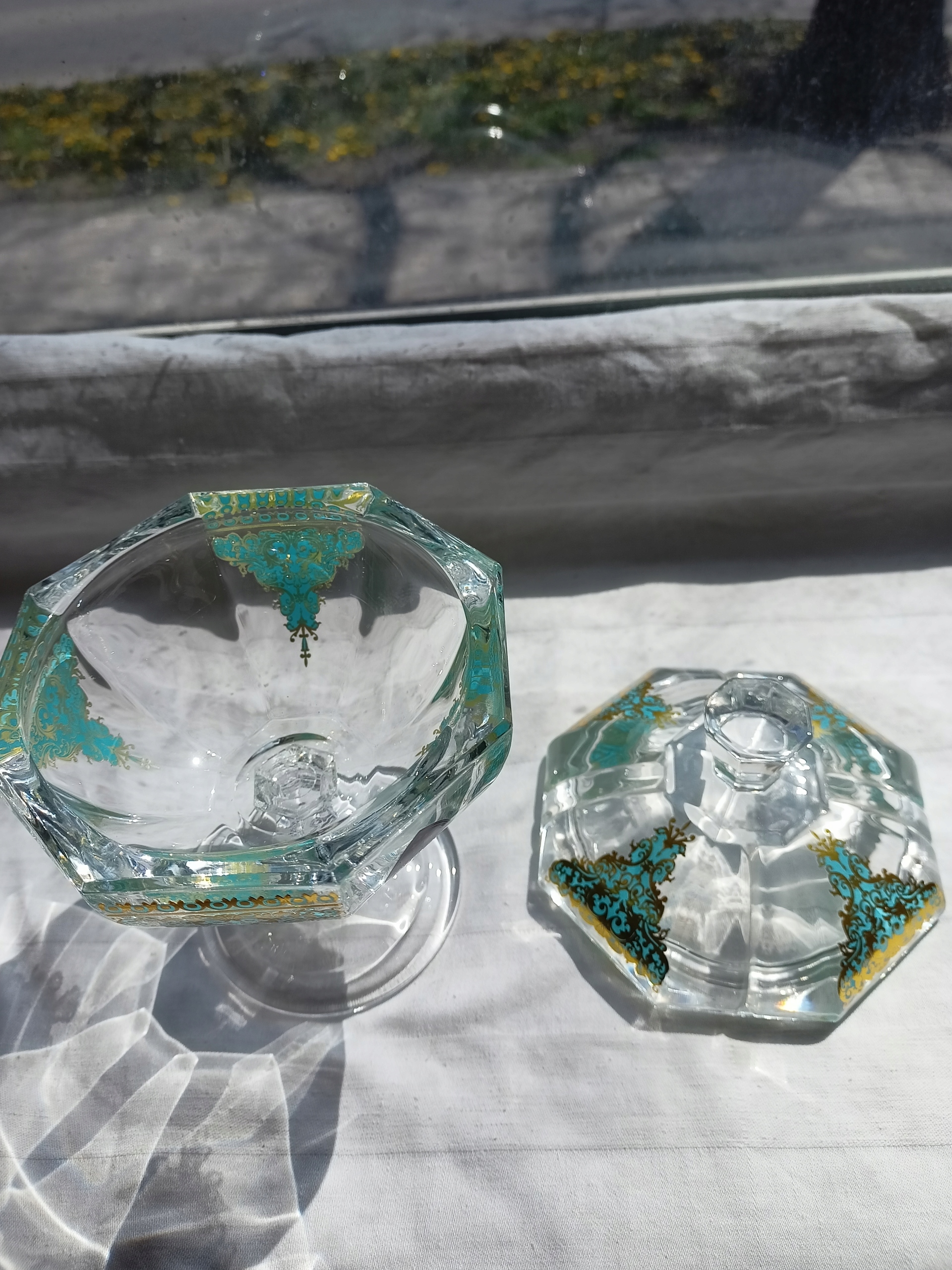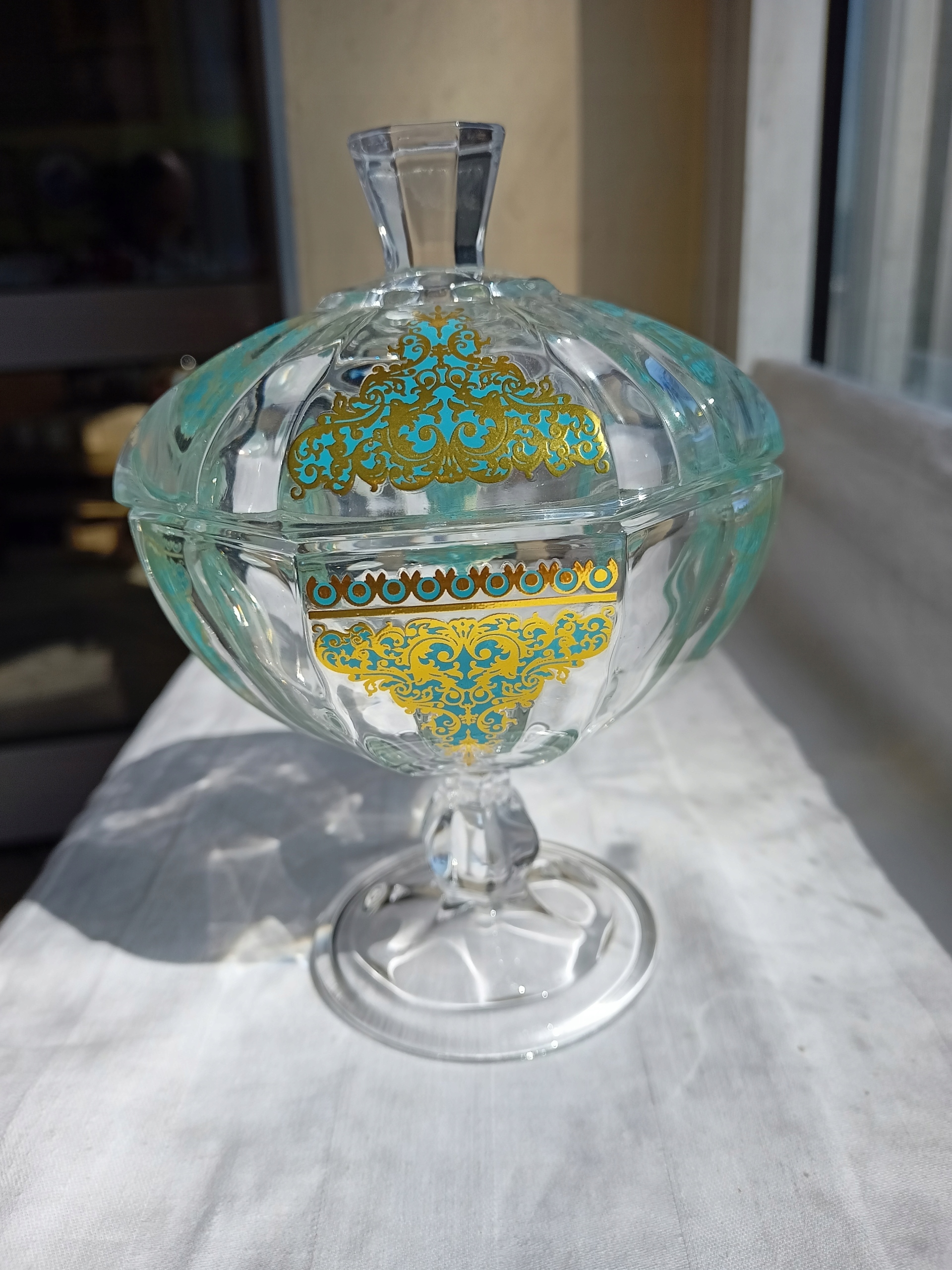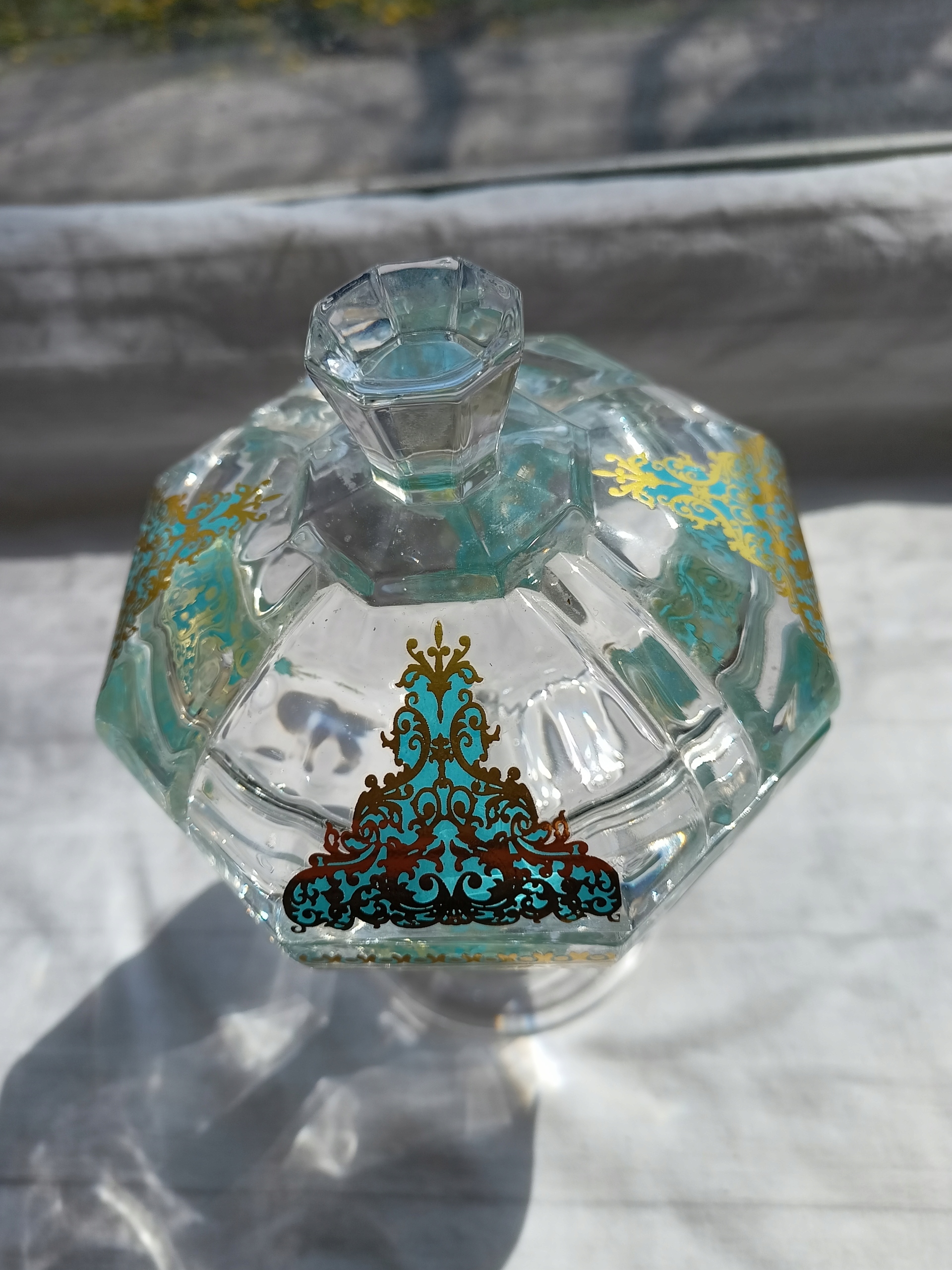 - Кондитерська на нозі з кришкою, зробленою в теперішній неіснуючій платі "Ірена" в Інороклаві. Пентекоратор Huta - один шматок. Не зустрічається на польському ринку. Вісім - кондитерський, прозорий, прозорий з відкритою роботою, золото - бірюзове прикраса. Для фіксації та захисту вистрілено на 500 градусів. CM. Підпис Huta Irena.