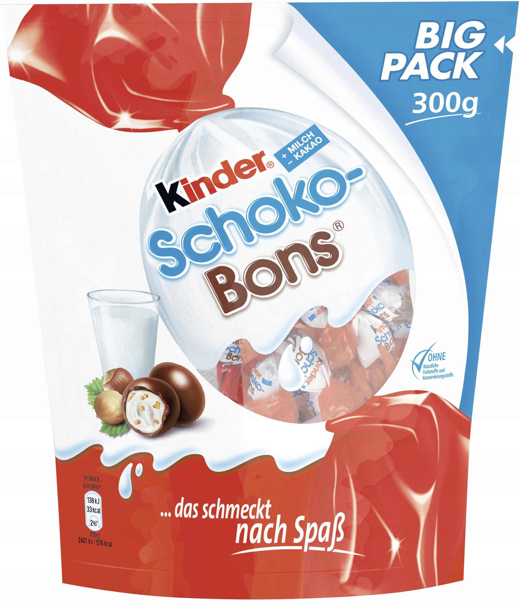 Kinder Schokobons — це знежирені шоколадні яйця з молочною начинкою (42,5%) і дрібно подрібненим фундуком, вони не тануть у роті, кремоподібні та хрусткі та надзвичайно популярні не лише серед дітей.