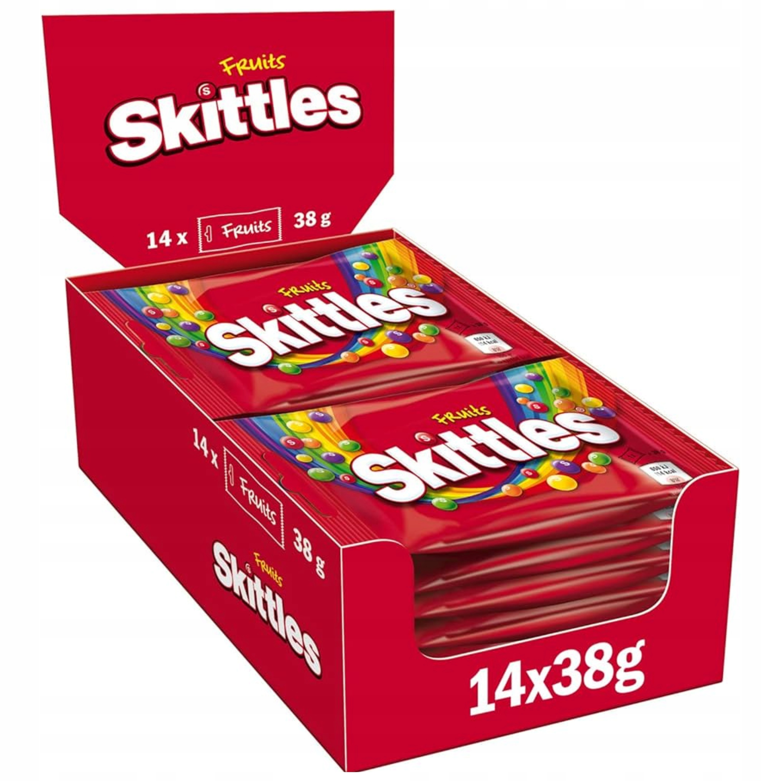 - Кількість: 14 упаковок Skittles, кожна вагою 38 г.