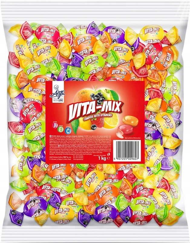 Цукерки VITA-MIX, упаковка 1 кг містить 5 фруктових смаків: полуниця лимон яблуко апельсин чорна смородина Цукерки з начинкою виготовлені на основі фруктових соків з додаванням вітамінів А, Е та С. Не містять глютену, тому безпечні для людей, які уникають цього алергену.