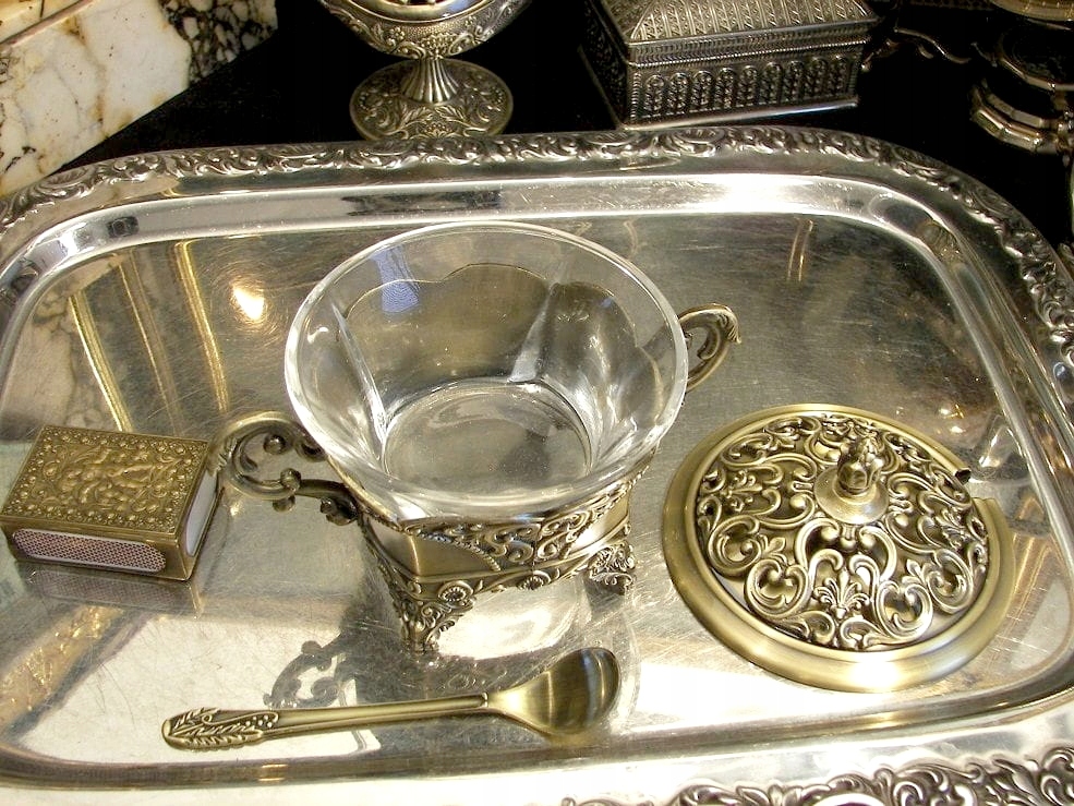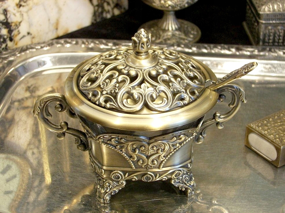 Запрошую на ставку на красиву цукорницю з ложкою.Кольор старого золота,багато декоровані поверхні. Чудова, ажурна обкладинка. Контрастні форми, кругла кришка і квадратне дно, виглядає чудово. Весь виготовлений зі сплаву цинку, покритого латунню. Воно того варте, річ красива. Також це чудова ідея для оригінального подарунка для особливої людини.